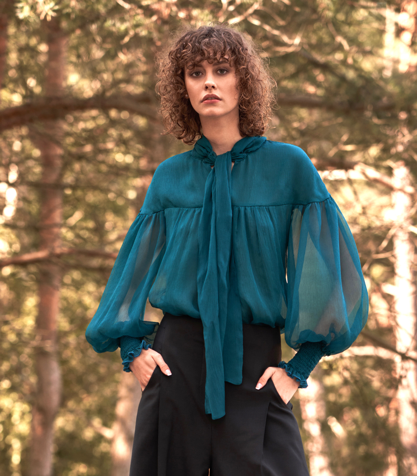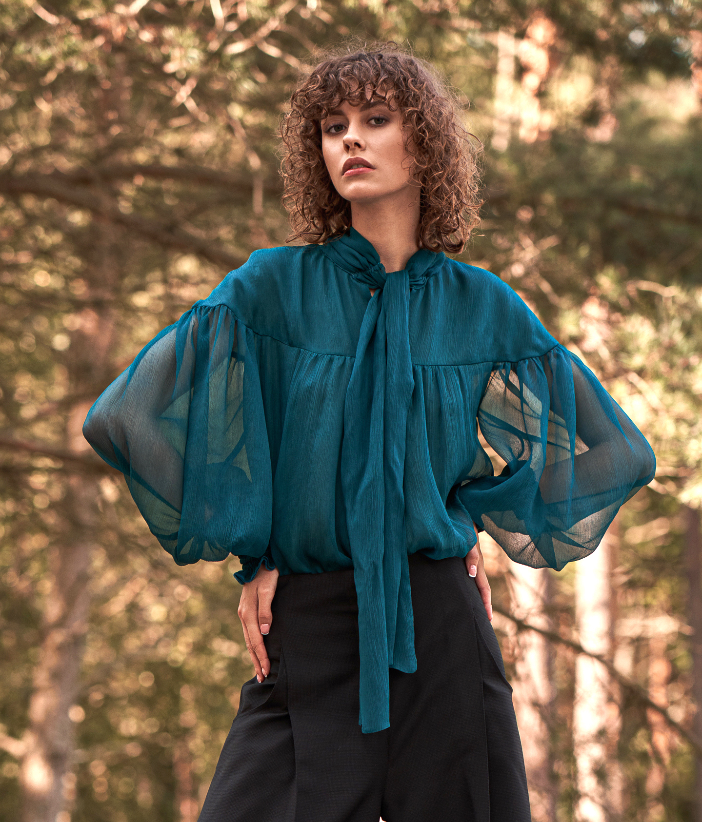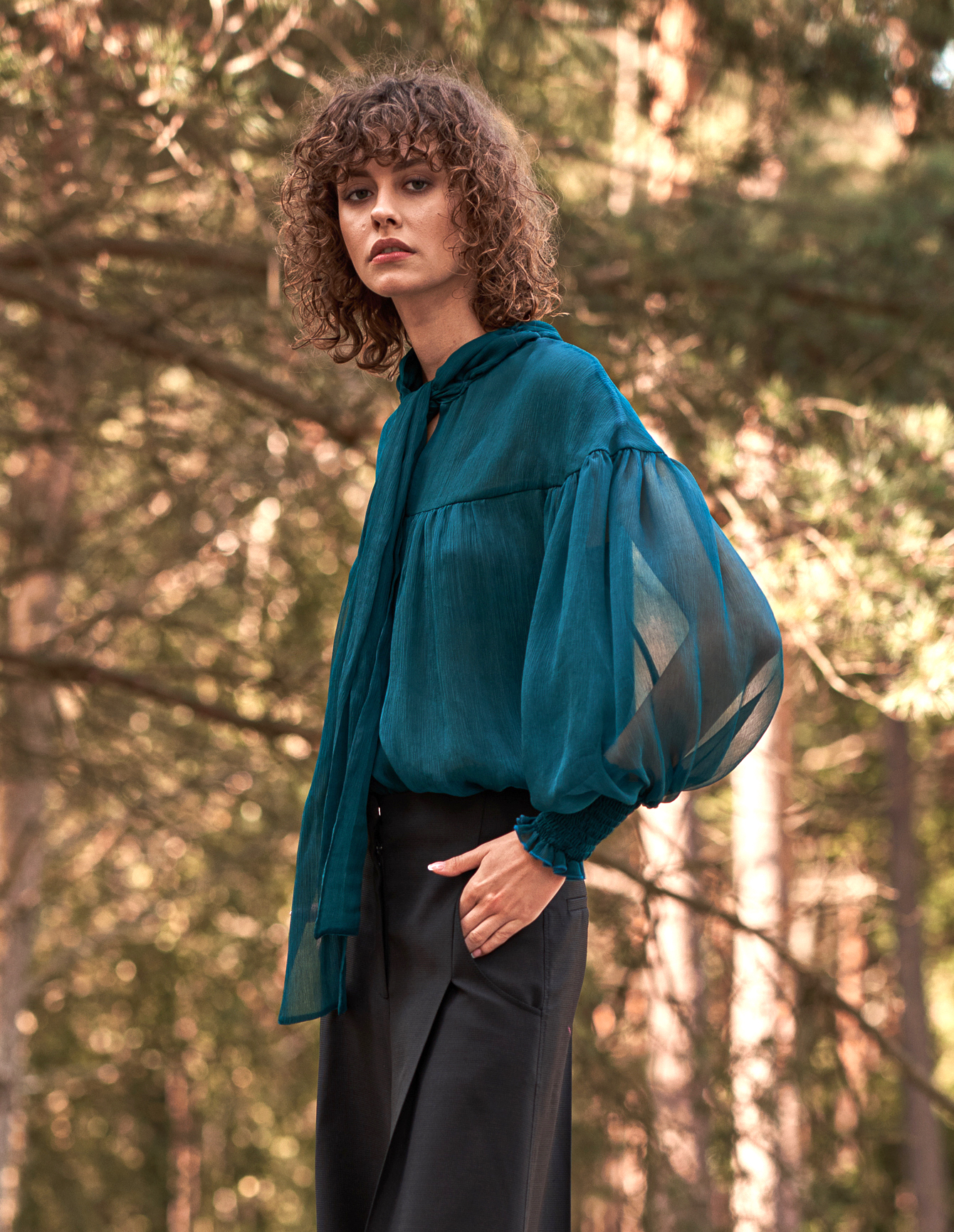 Ta elegancka jedwabna koszula w odcieniu głębokiego, szlachetnego turkusu wyróżnia się lekką, półtransparentną tkaniną o delikatnym, gniecionym wykończeniu. Górną część zdobi szeroki karczek, z którego opadają lekkie fałdy nadające całości subtelnej objętości. Najbardziej wyrazistym elementem jest długi, miękki wiązany kokardą pasek pod szyją, pełniący funkcję eleganckiej apaszki. Rękawy obszerne i bardzo zwiewne, zakończone wysokimi, marszczonymi mankietami, które dodają całości poetyckiego, romantycznego charakteru.