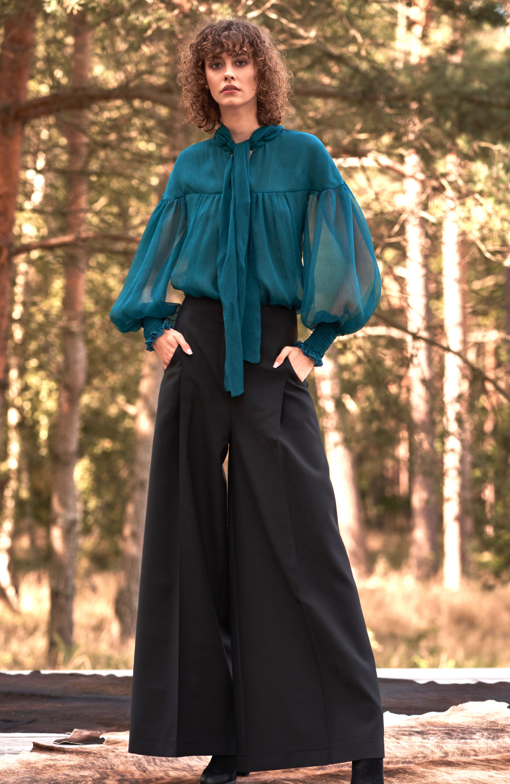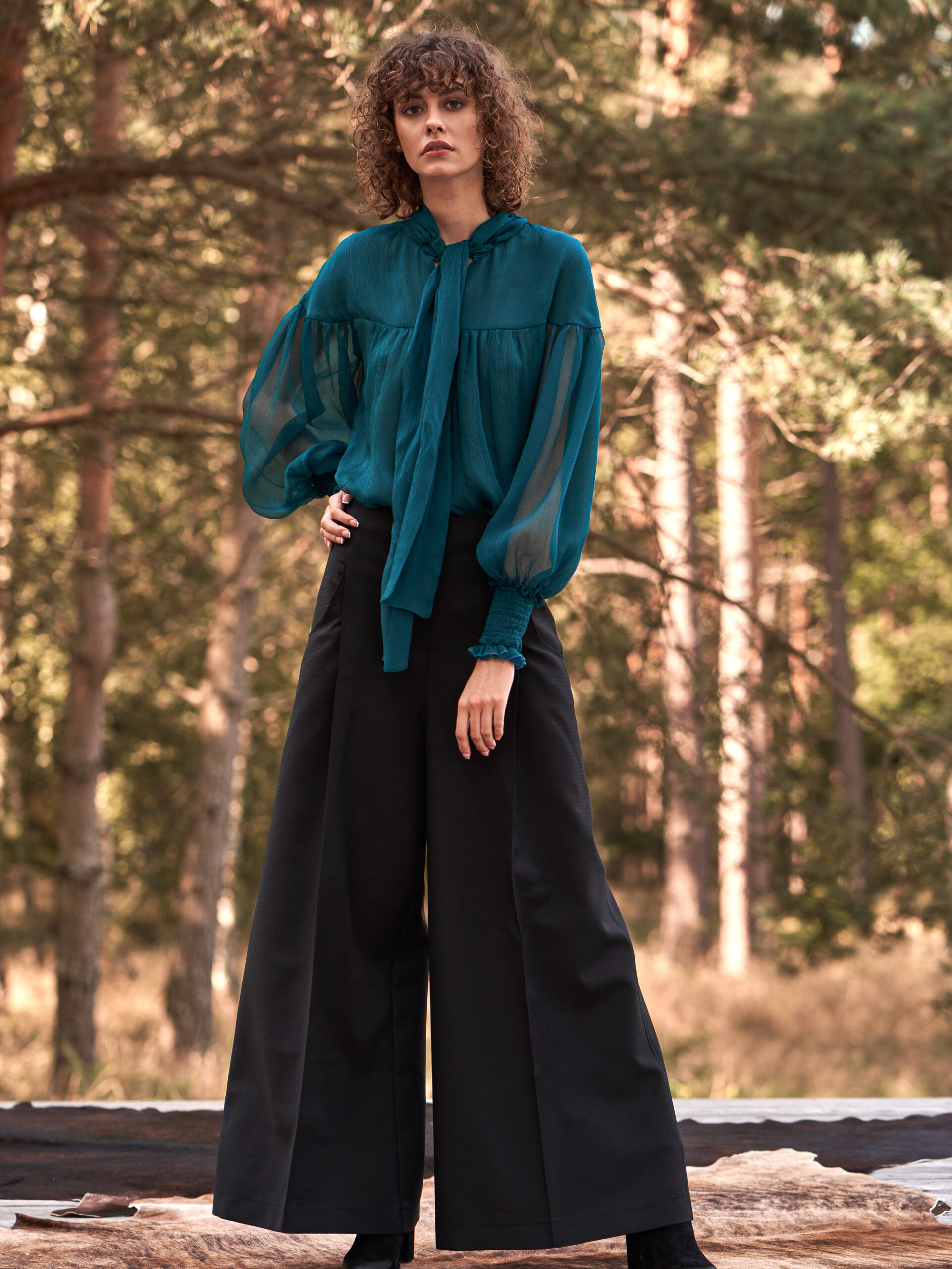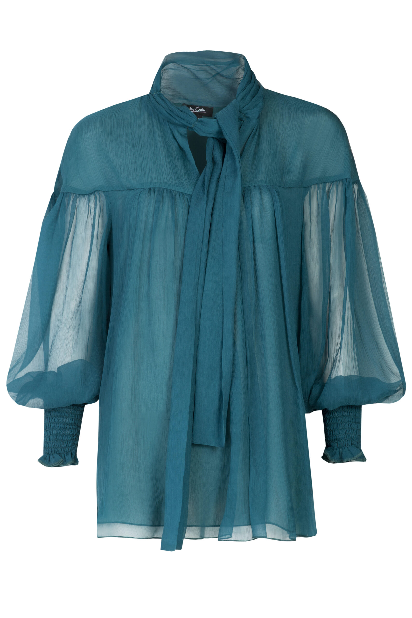 Ta elegancka jedwabna koszula w odcieniu głębokiego, szlachetnego turkusu wyróżnia się lekką, półtransparentną tkaniną o delikatnym, gniecionym wykończeniu. Górną część zdobi szeroki karczek, z którego opadają lekkie fałdy nadające całości subtelnej objętości. Najbardziej wyrazistym elementem jest długi, miękki wiązany kokardą pasek pod szyją, pełniący funkcję eleganckiej apaszki. Rękawy obszerne i bardzo zwiewne, zakończone wysokimi, marszczonymi mankietami, które dodają całości poetyckiego, romantycznego charakteru.