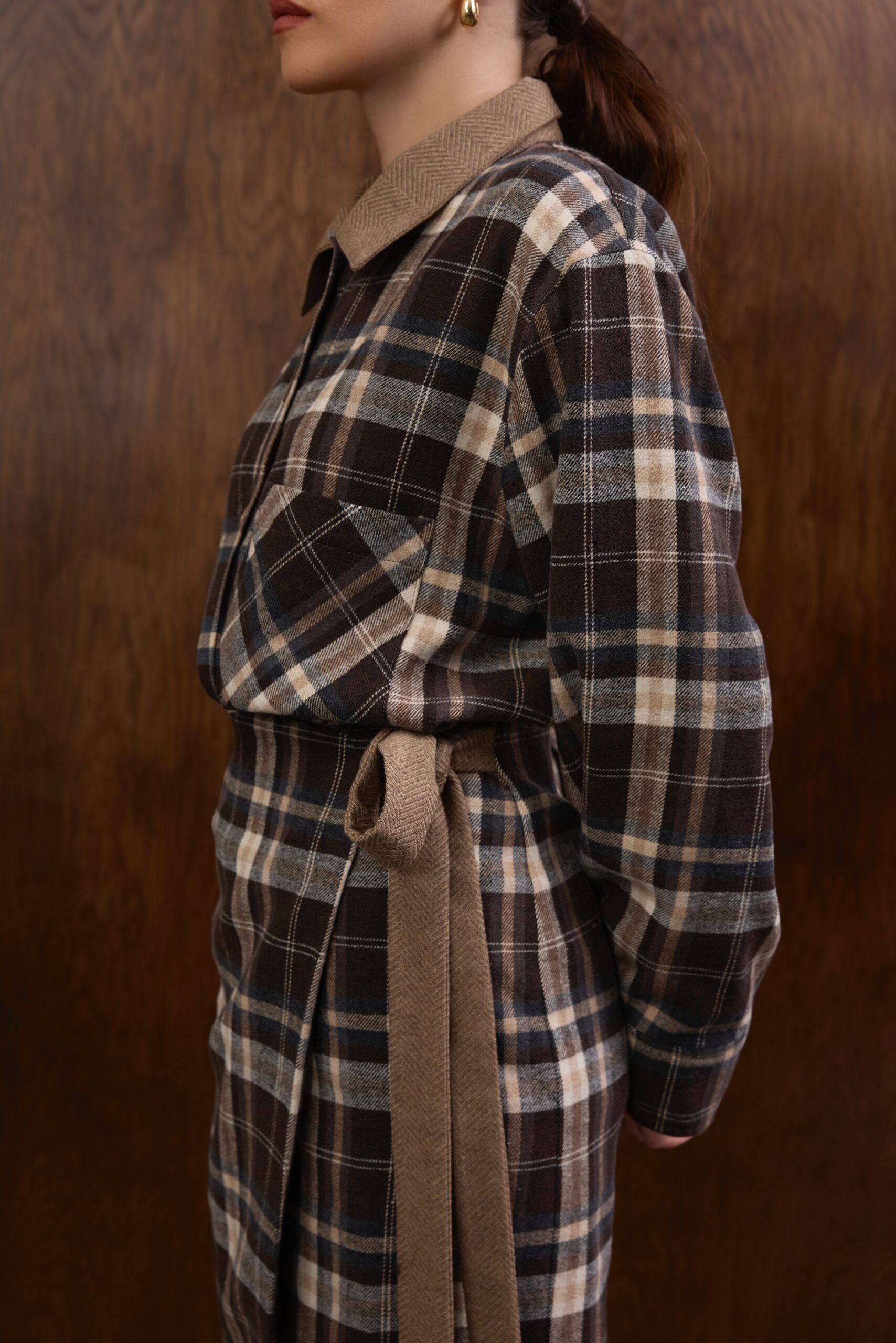 Jej luźny, niewymuszony fason subtelnie przełamuje tradycyjne ujęcie kraty, dodając całości nowoczesnej lekkości. Kontrastowy kołnierz z tkaniny o jodełkowym splocie nadaje projektowi wyjątkowy, dopracowany charakter, a naturalne guziki podkreślają rzemieślniczą jakość wykończenia.