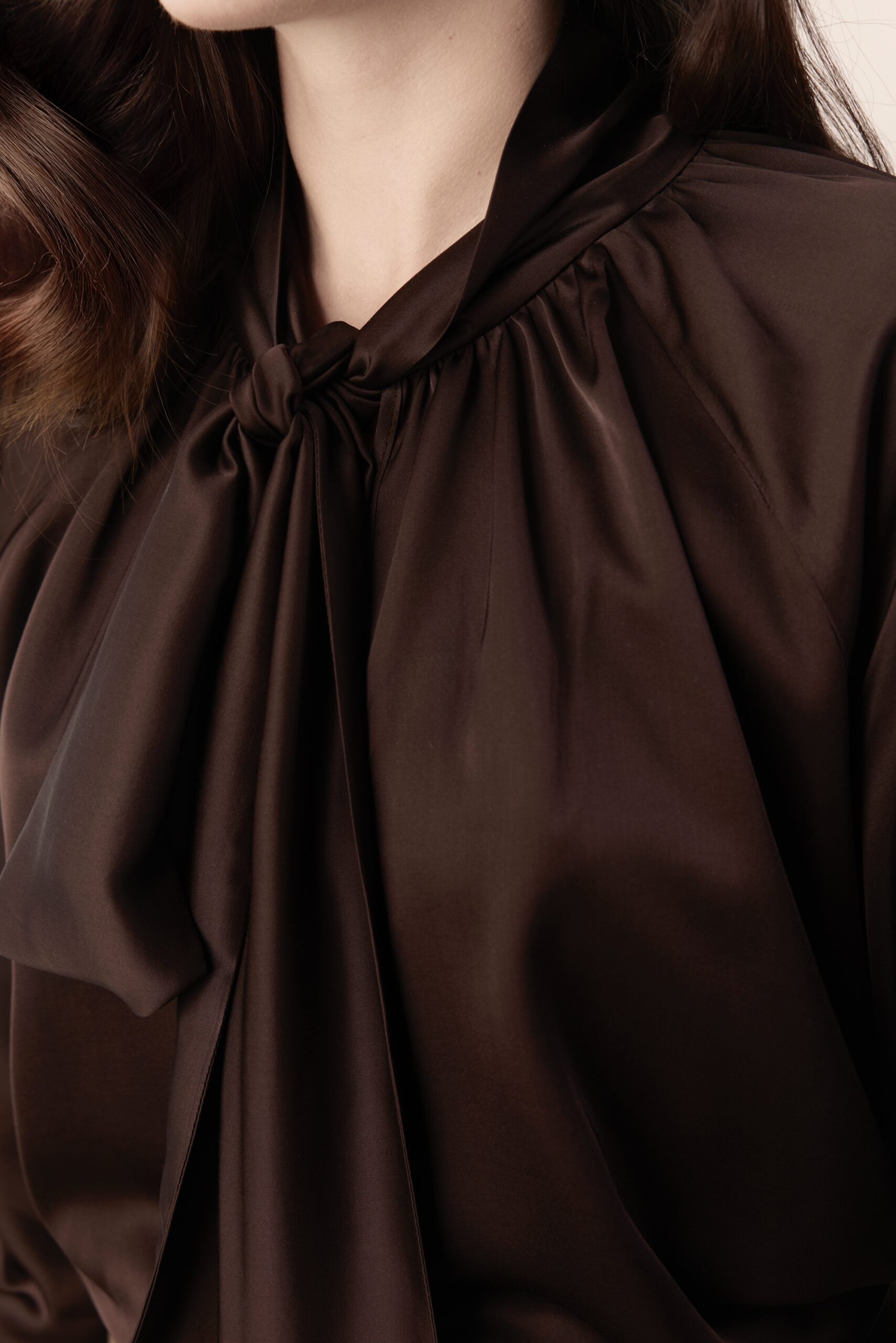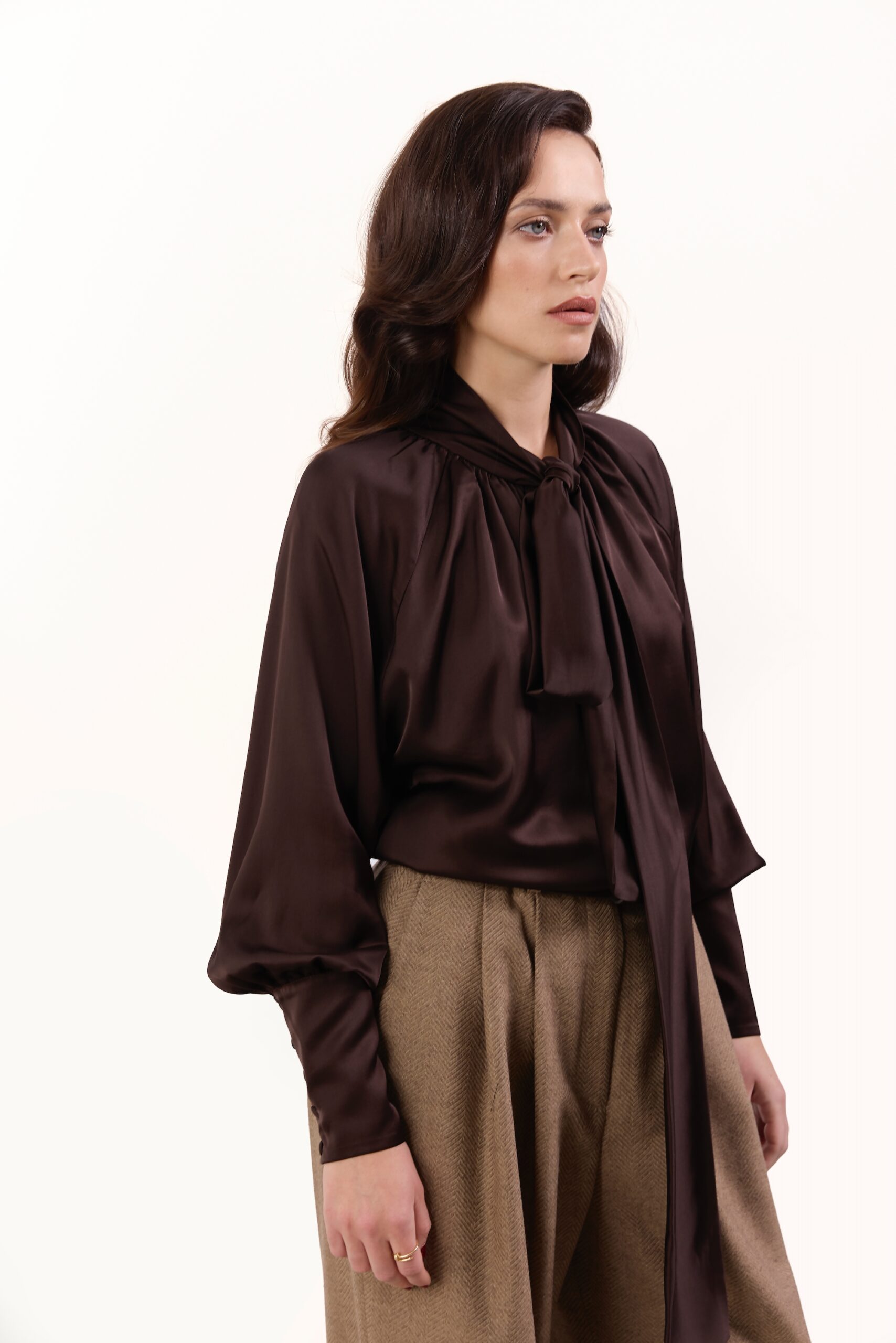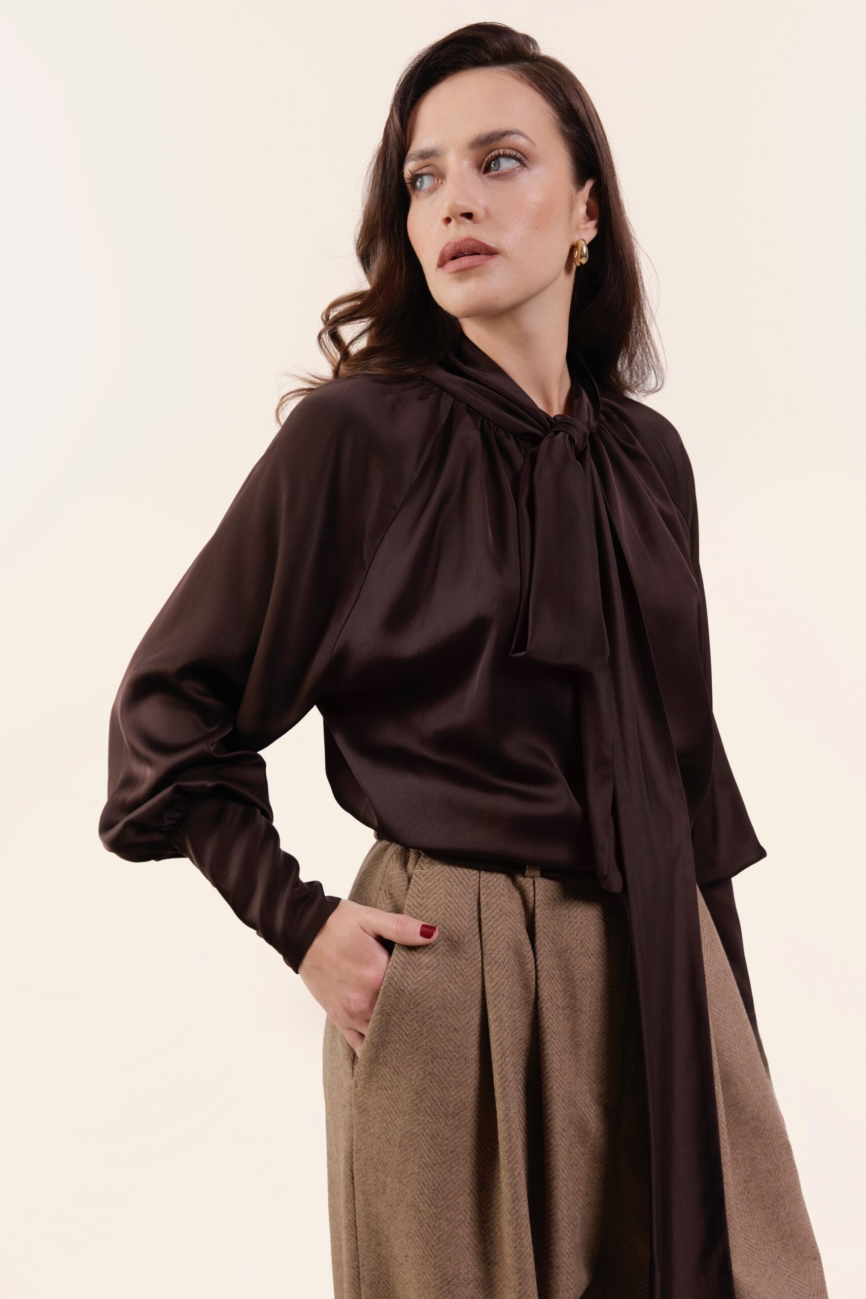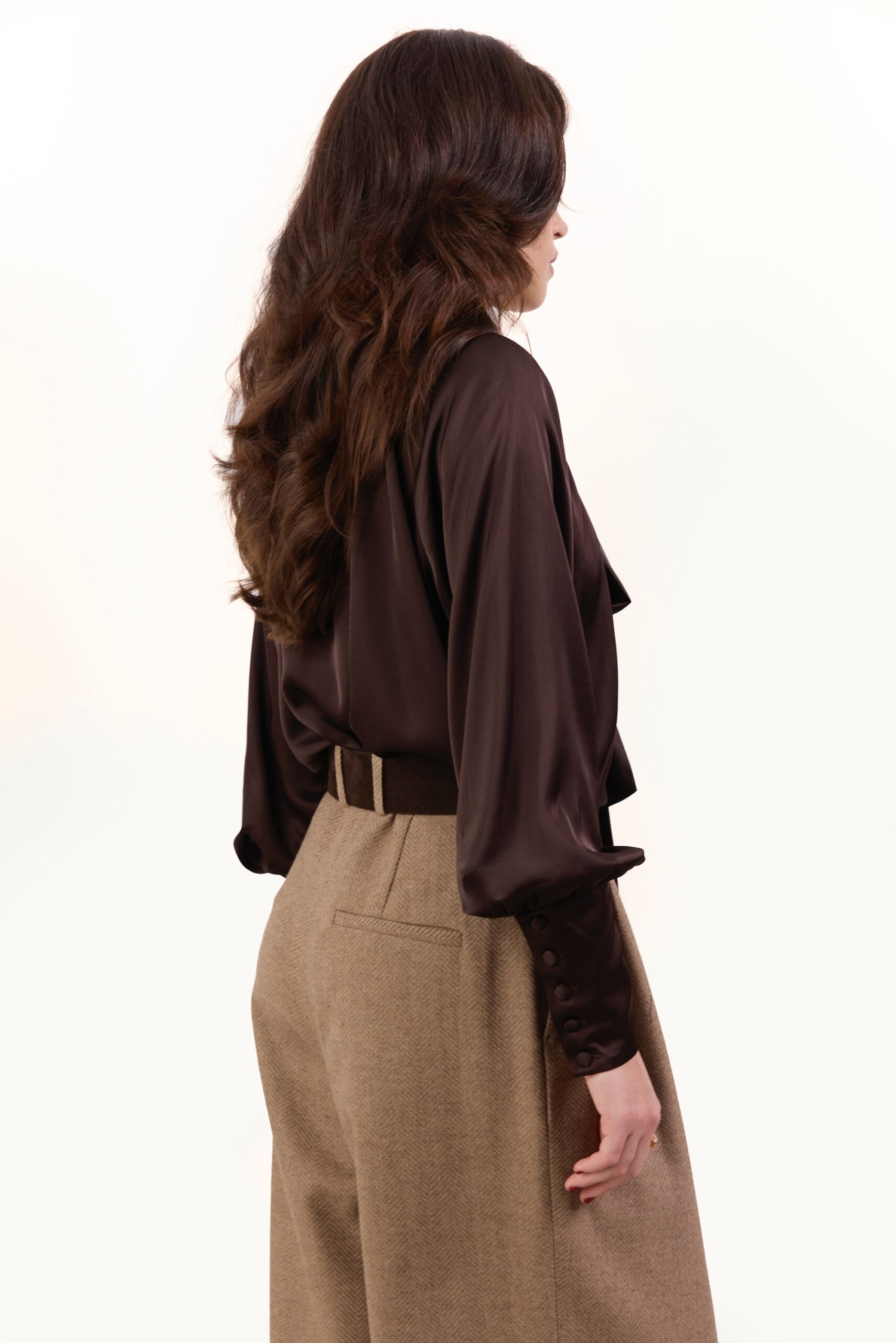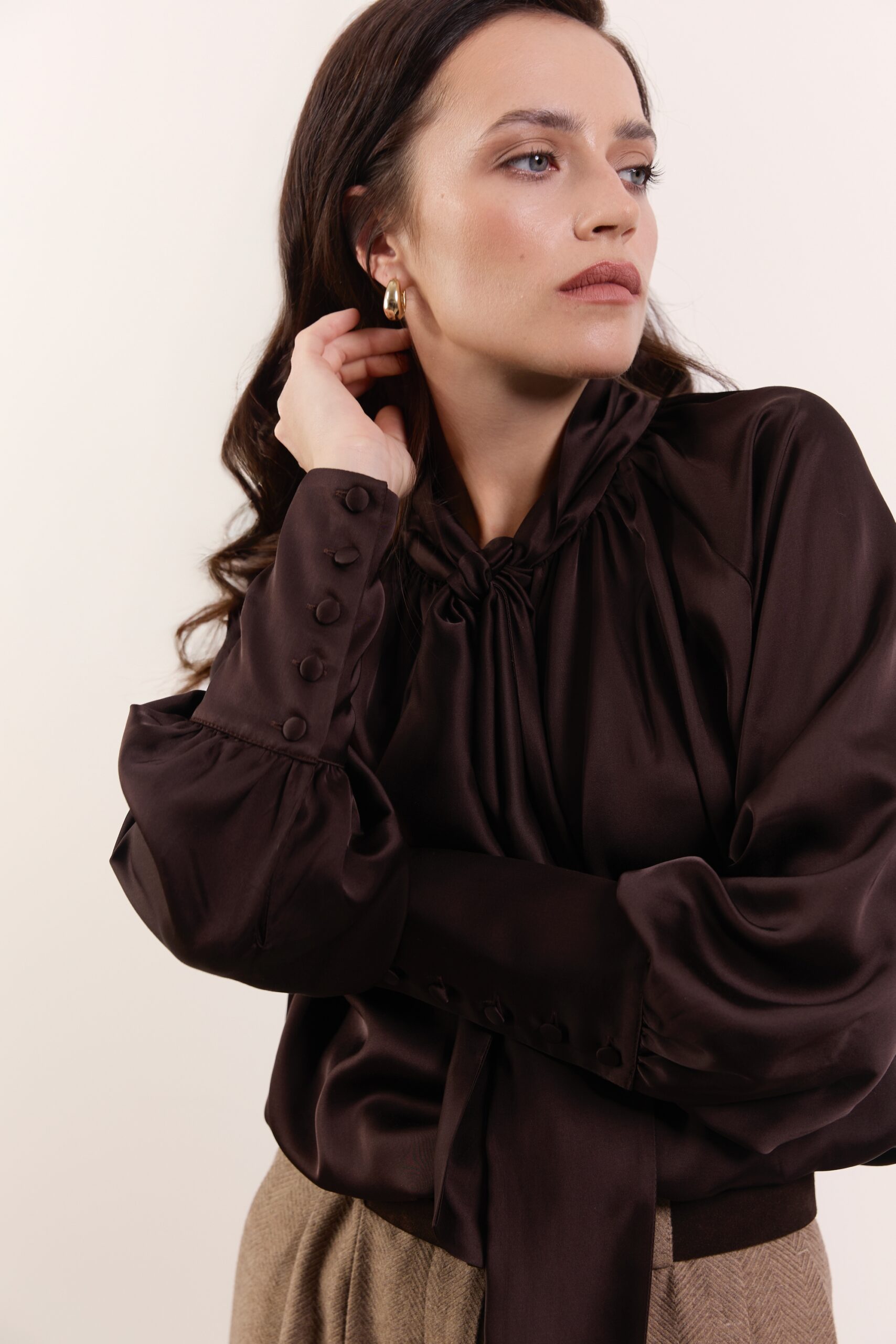Satynowa koszula w głębokim, czekoladowym odcieniu to esencja wyrafinowanej prostoty i zmysłowej elegancji. Miękka, płynnie układająca się tkanina pięknie odbija światło, podkreślając szlachetny charakter modelu, a subtelne marszczenia wokół dekoltu nadają mu miękką, kobiecą linię.