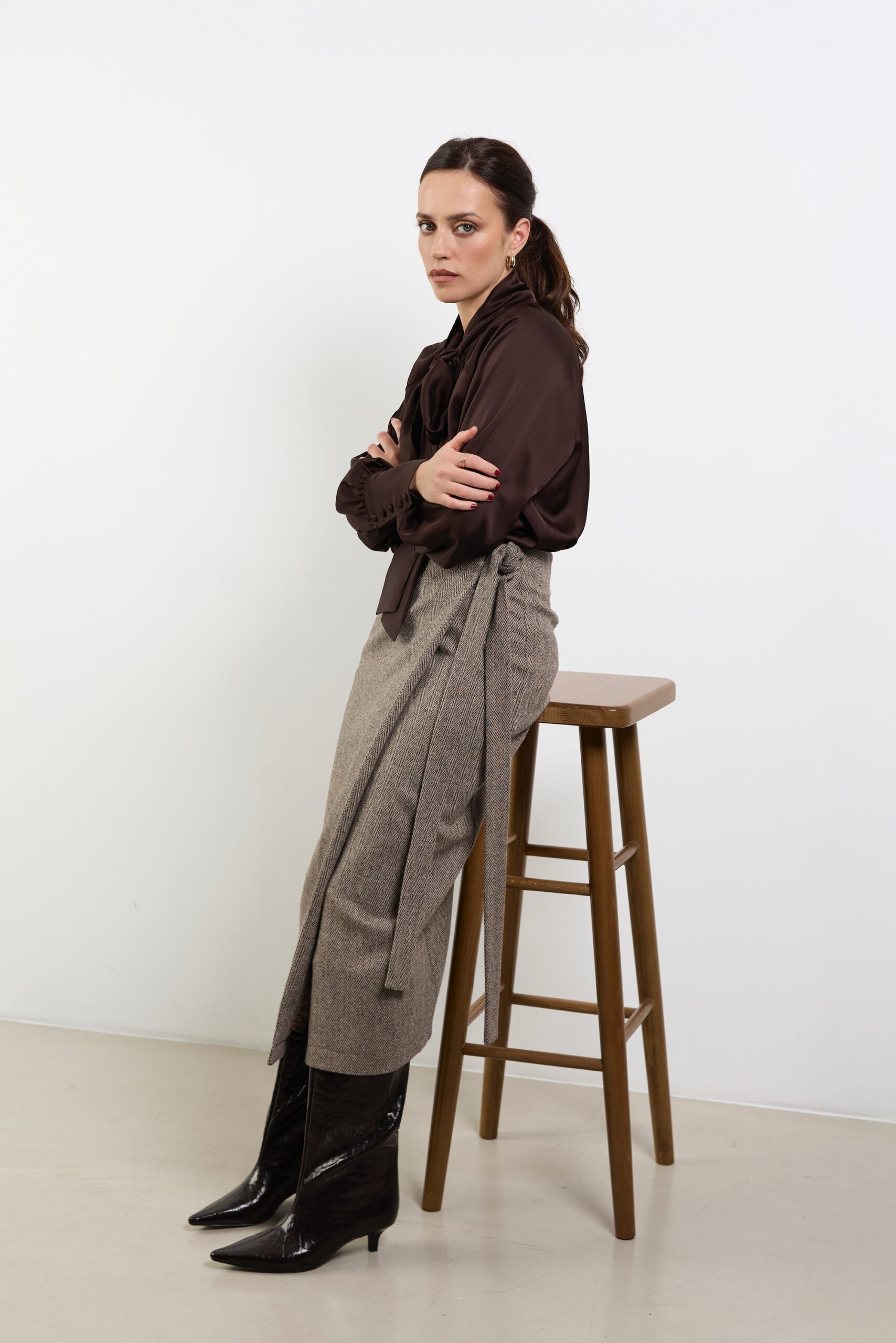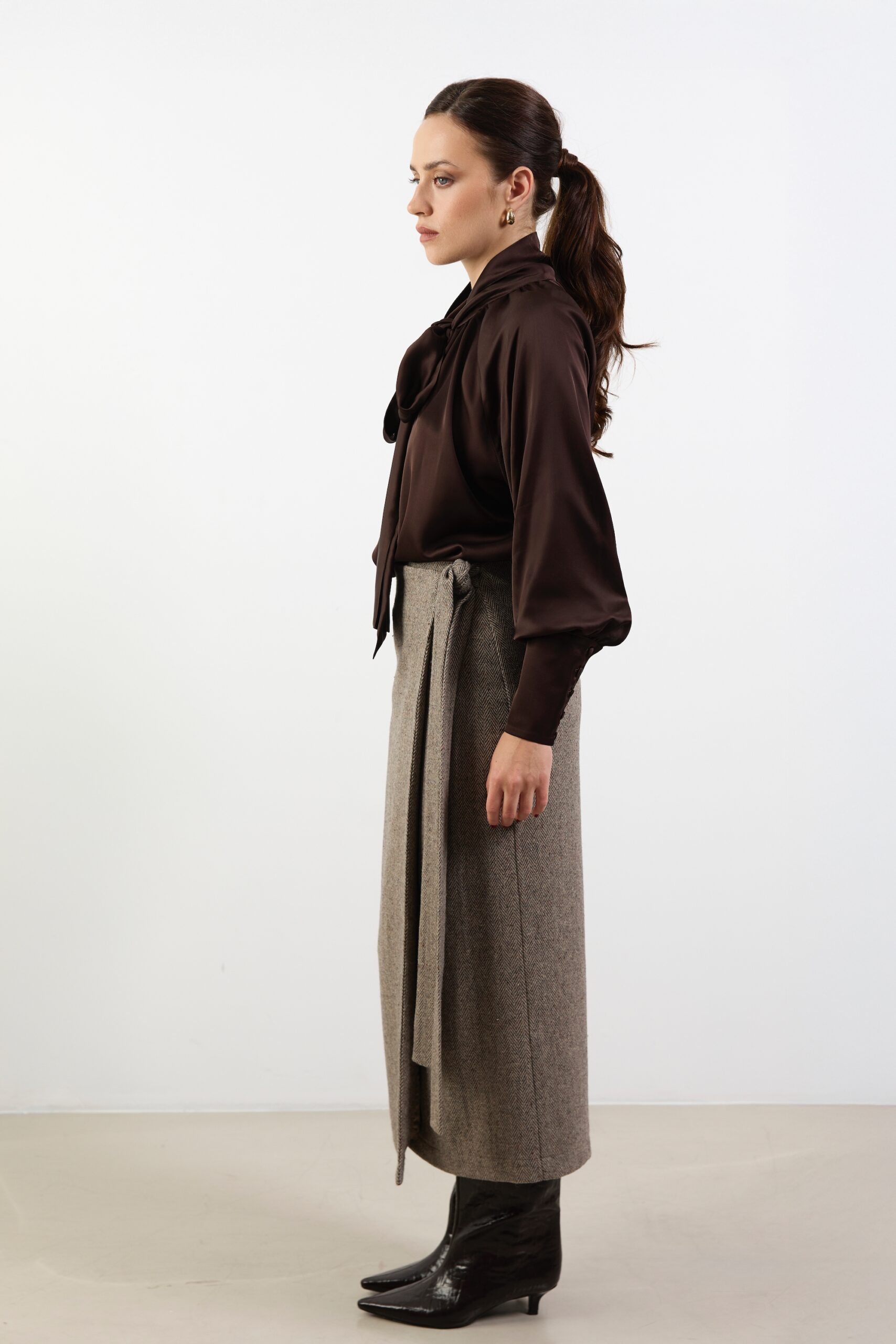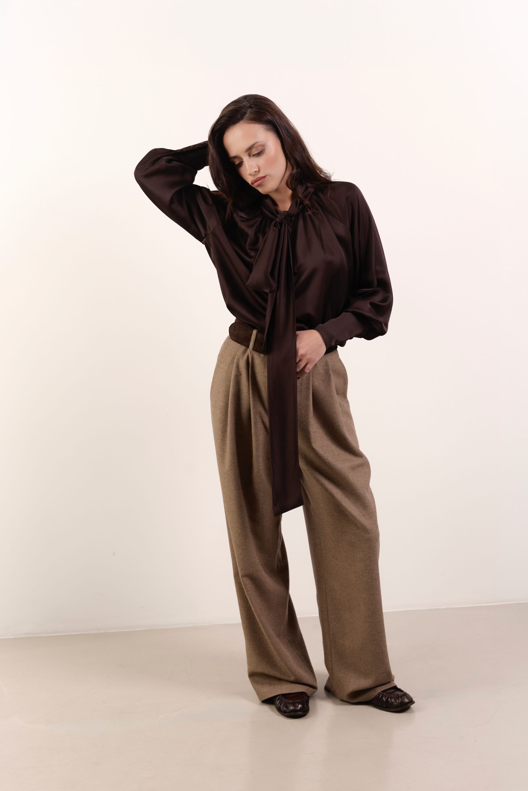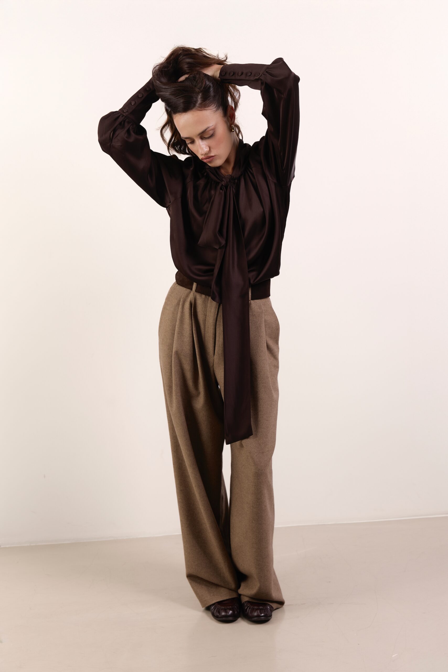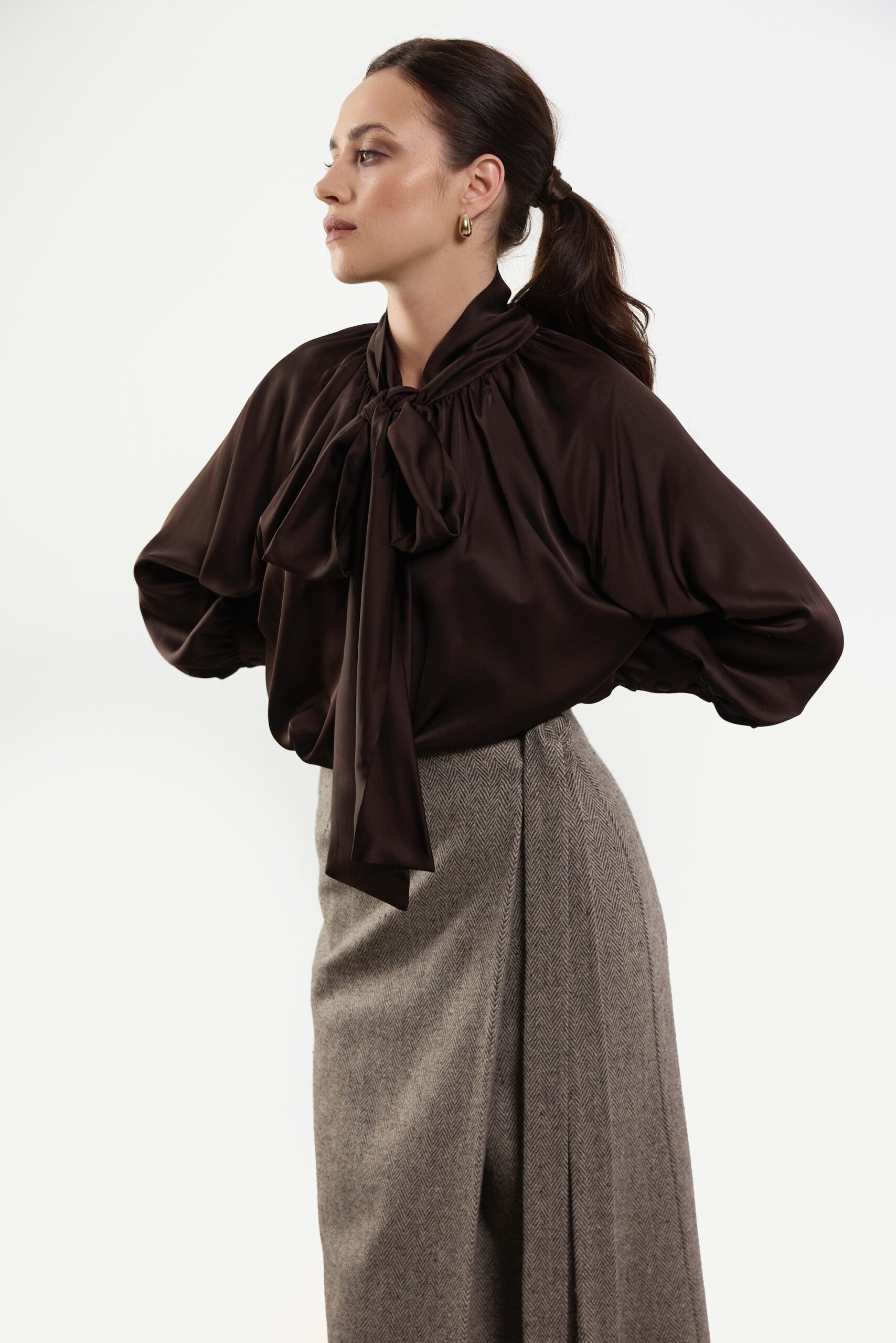 Satynowa koszula w głębokim, czekoladowym odcieniu to esencja wyrafinowanej prostoty i zmysłowej elegancji. Miękka, płynnie układająca się tkanina pięknie odbija światło, podkreślając szlachetny charakter modelu, a subtelne marszczenia wokół dekoltu nadają mu miękką, kobiecą linię.