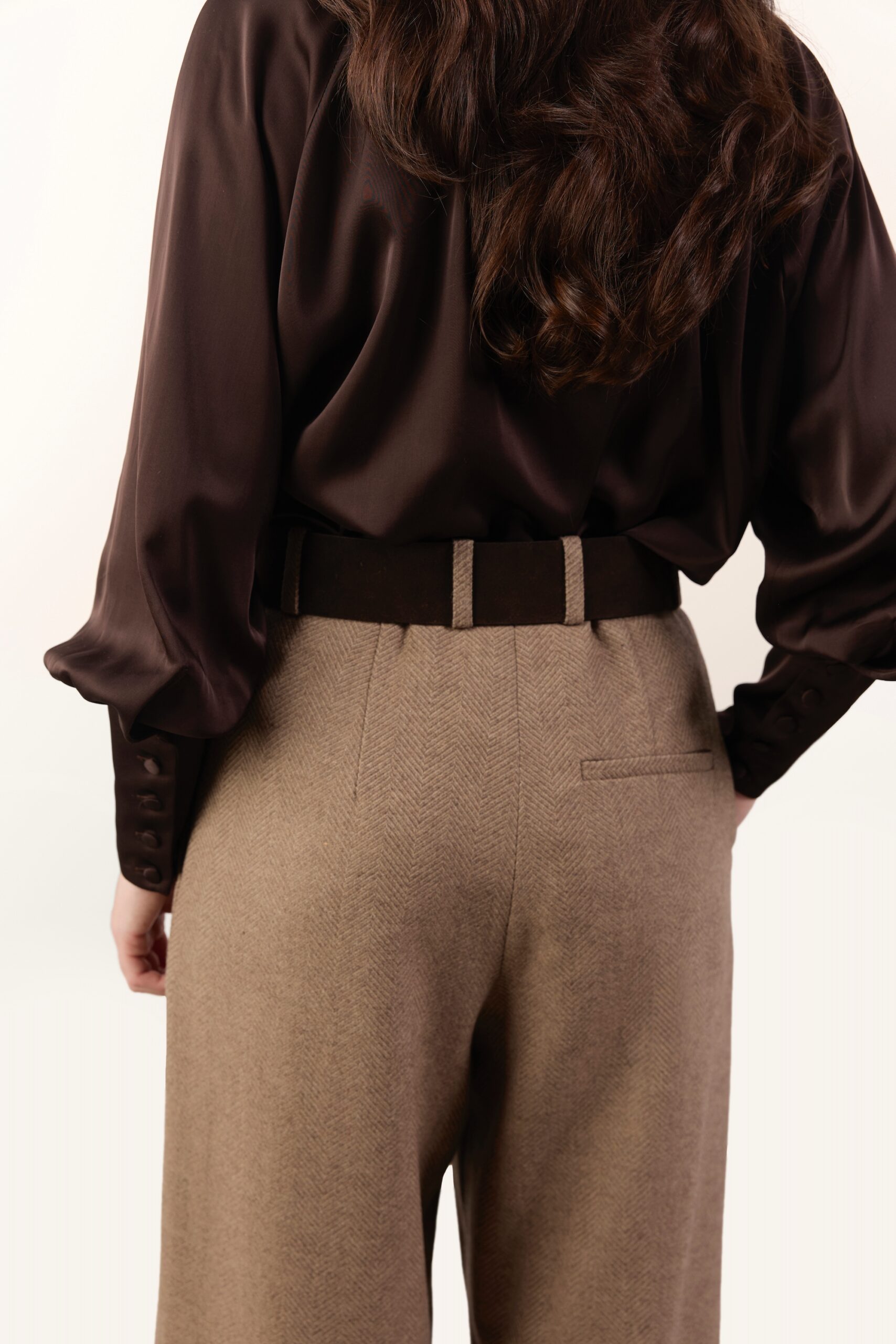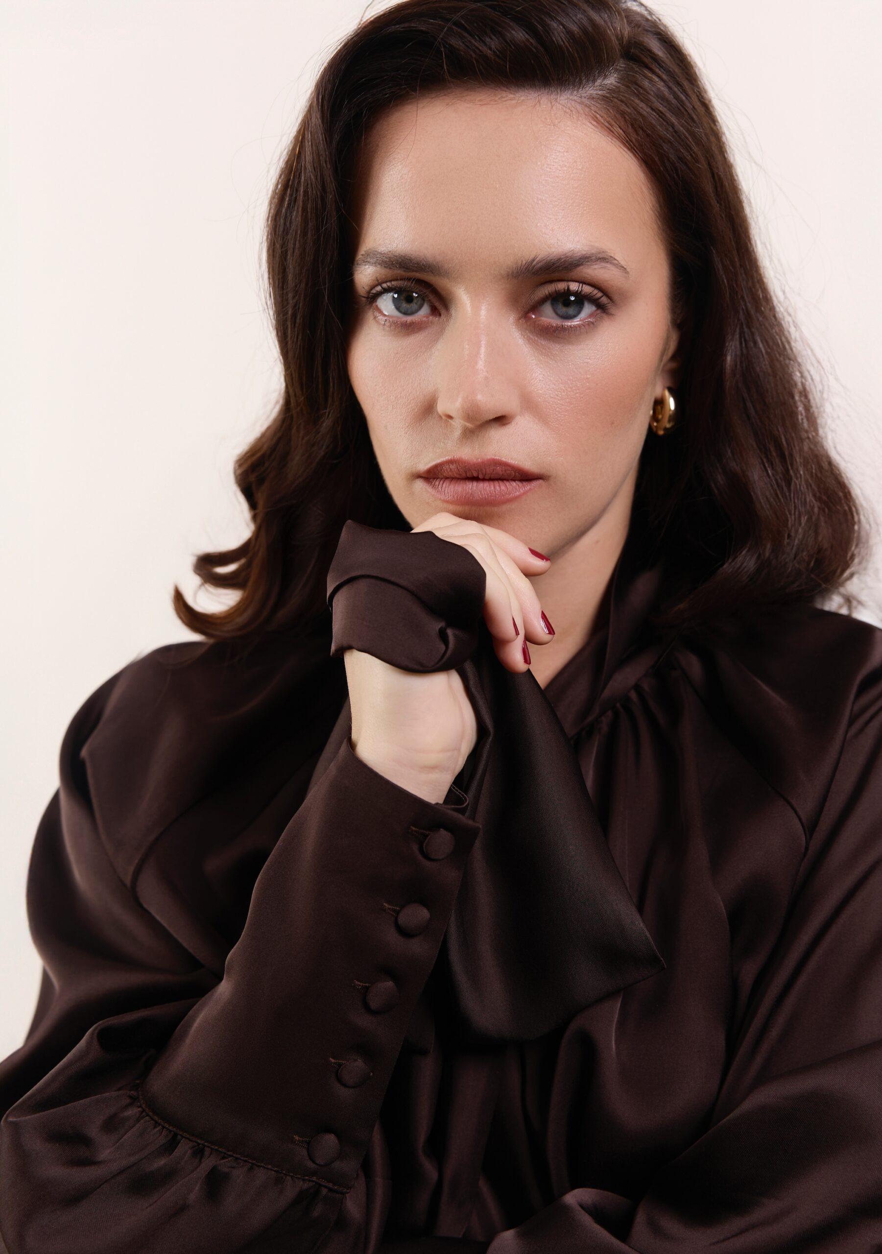 Raglanowe rękawy zakończone są mankietami z obciąganymi materiałem guzikami — eleganckim, couture’owym wykończeniem, które dopełnia całość w duchu ponadczasowego luksusu. Koszula doskonale prezentuje się zarówno w stylizacjach wieczorowych, jak i w dziennych zestawach z wełnianymi spodniami czy spódnicami z kolekcji.