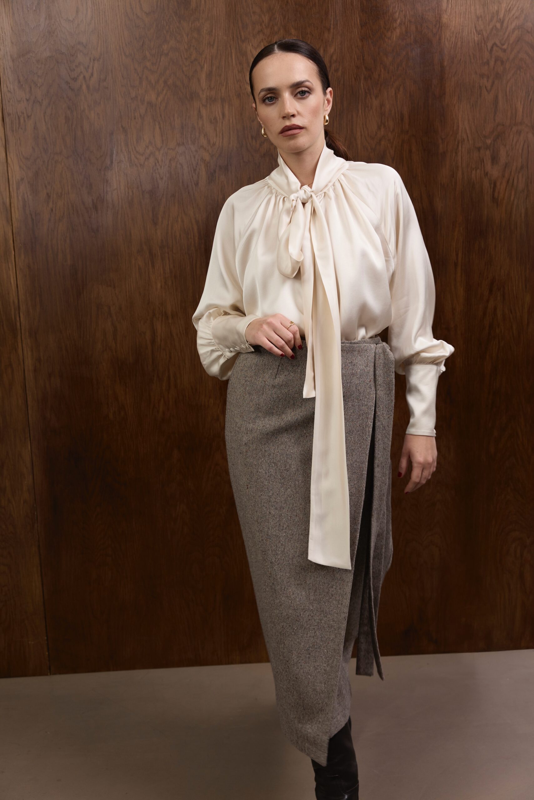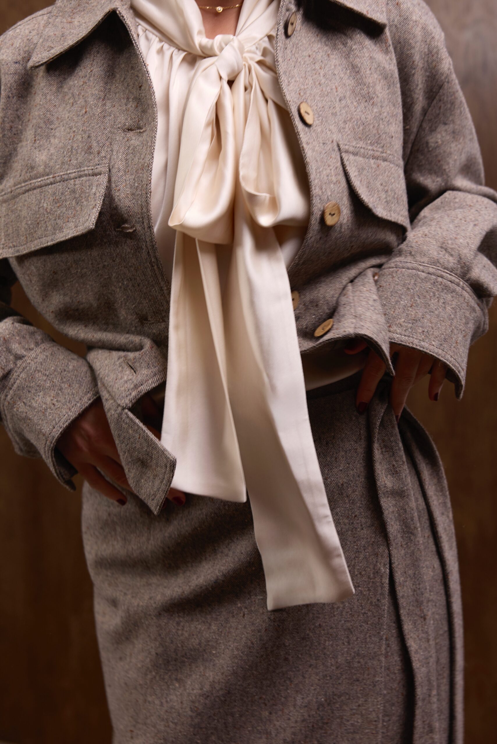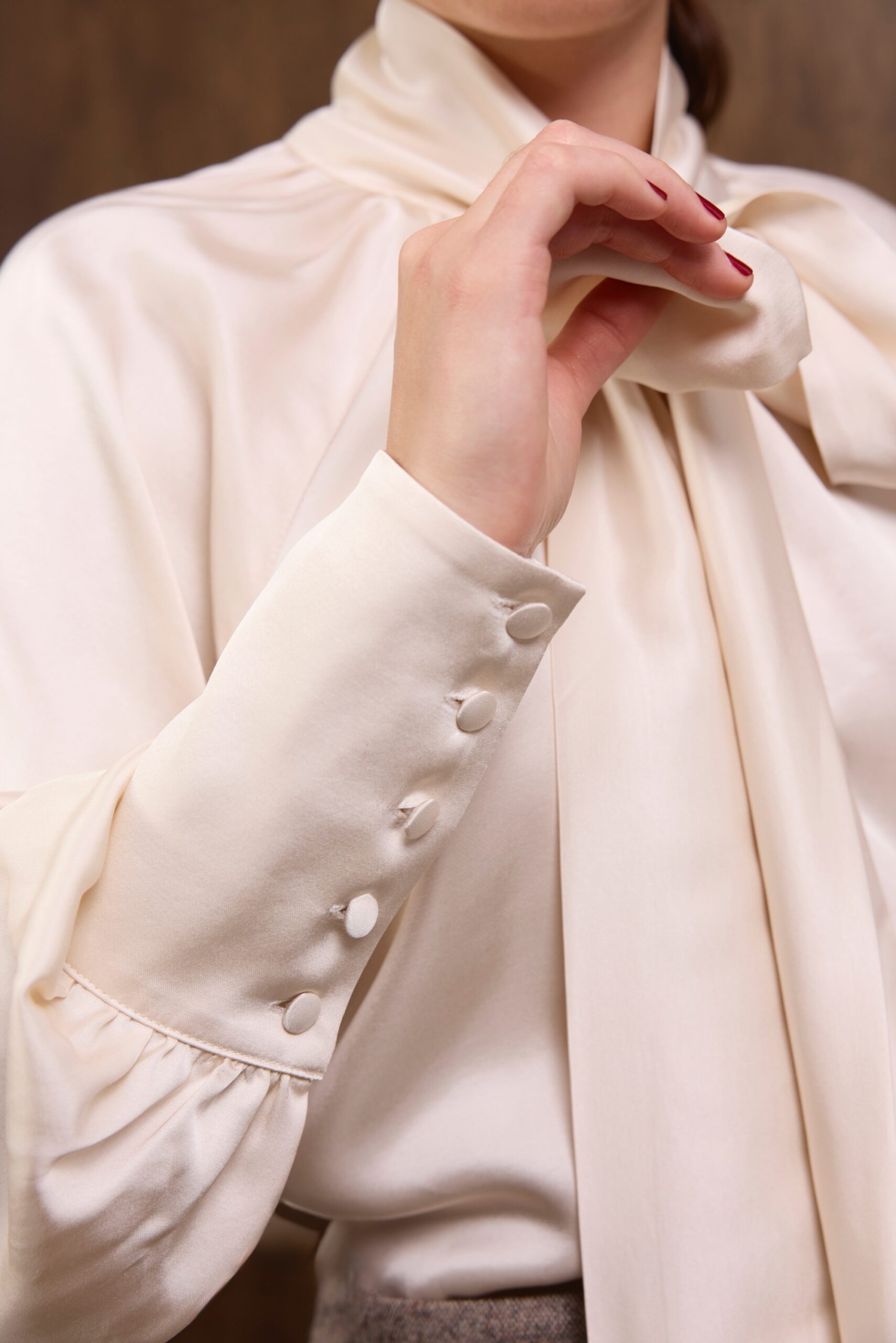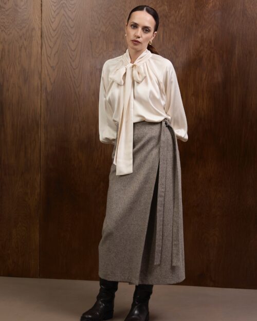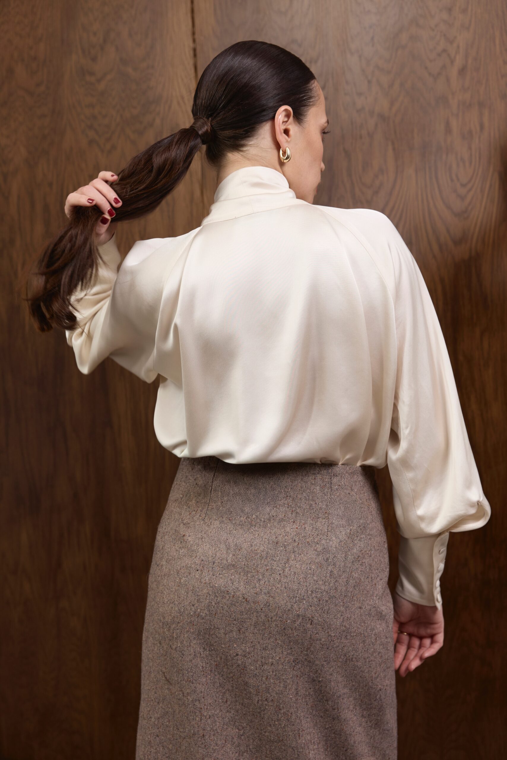 Raglanowe rękawy zakończone są mankietami z obciąganymi materiałem guzikami — eleganckim, couture’owym wykończeniem, które dopełnia całość w duchu ponadczasowego luksusu. Koszula doskonale prezentuje się zarówno w stylizacjach wieczorowych, jak i w dziennych zestawach z wełnianymi spodniami czy spódnicami z kolekcji.