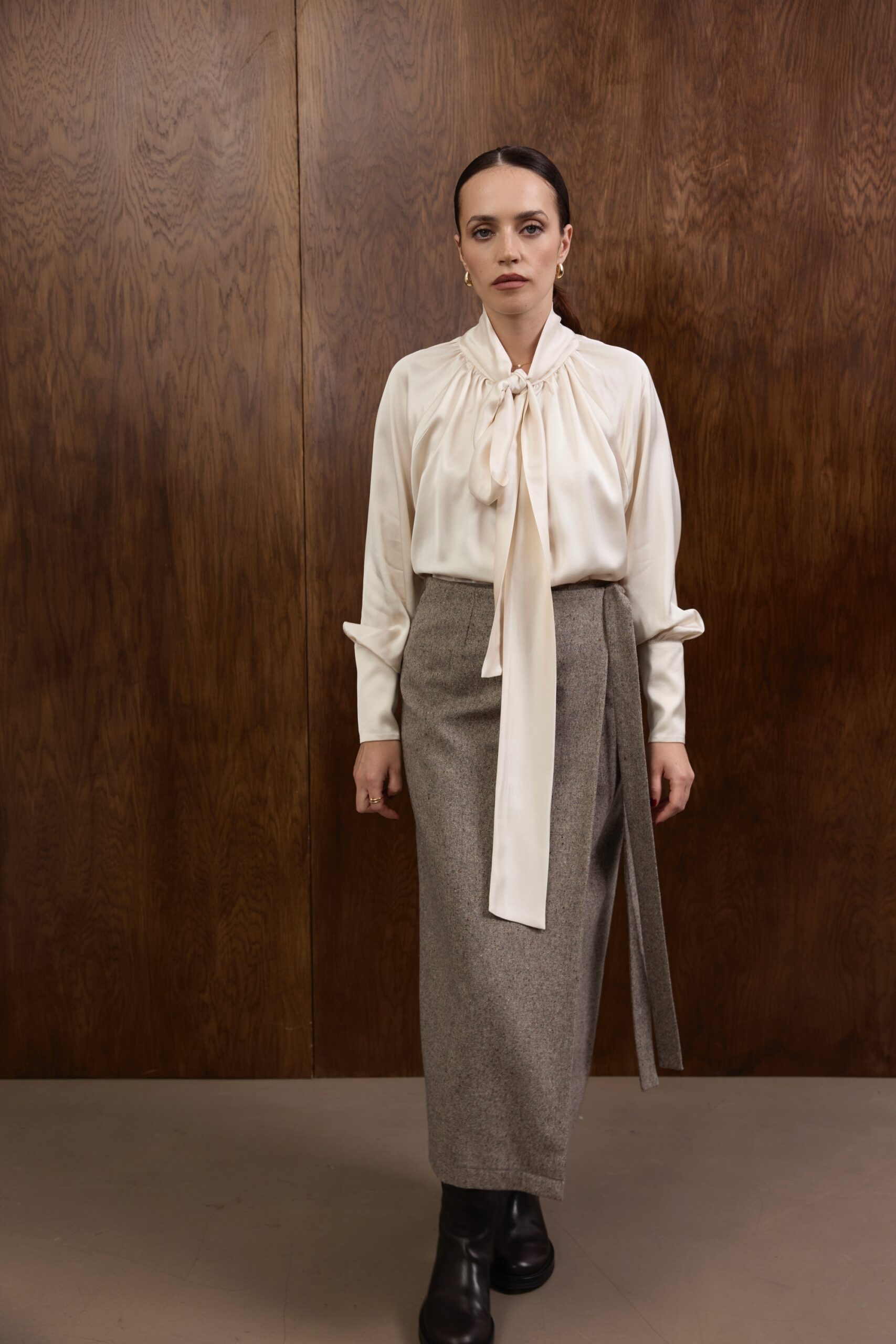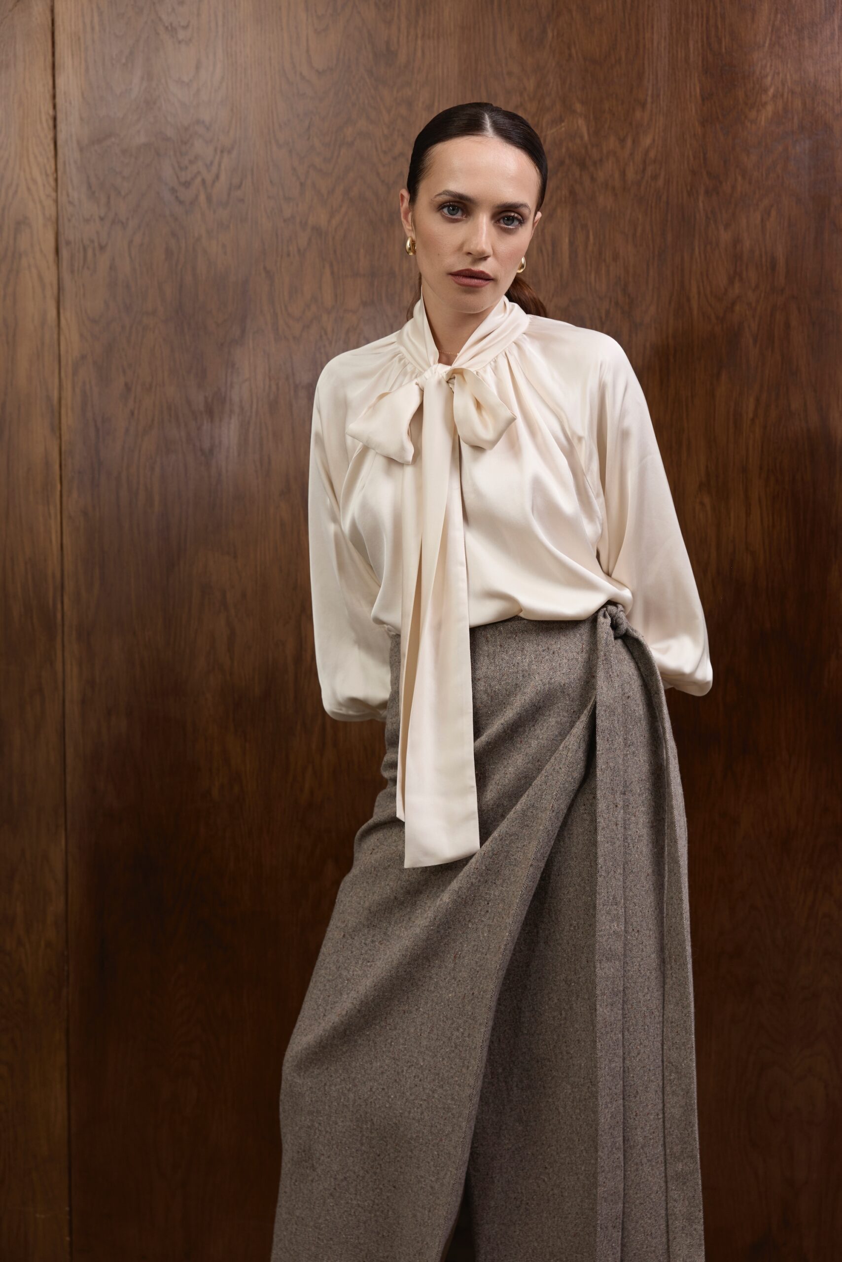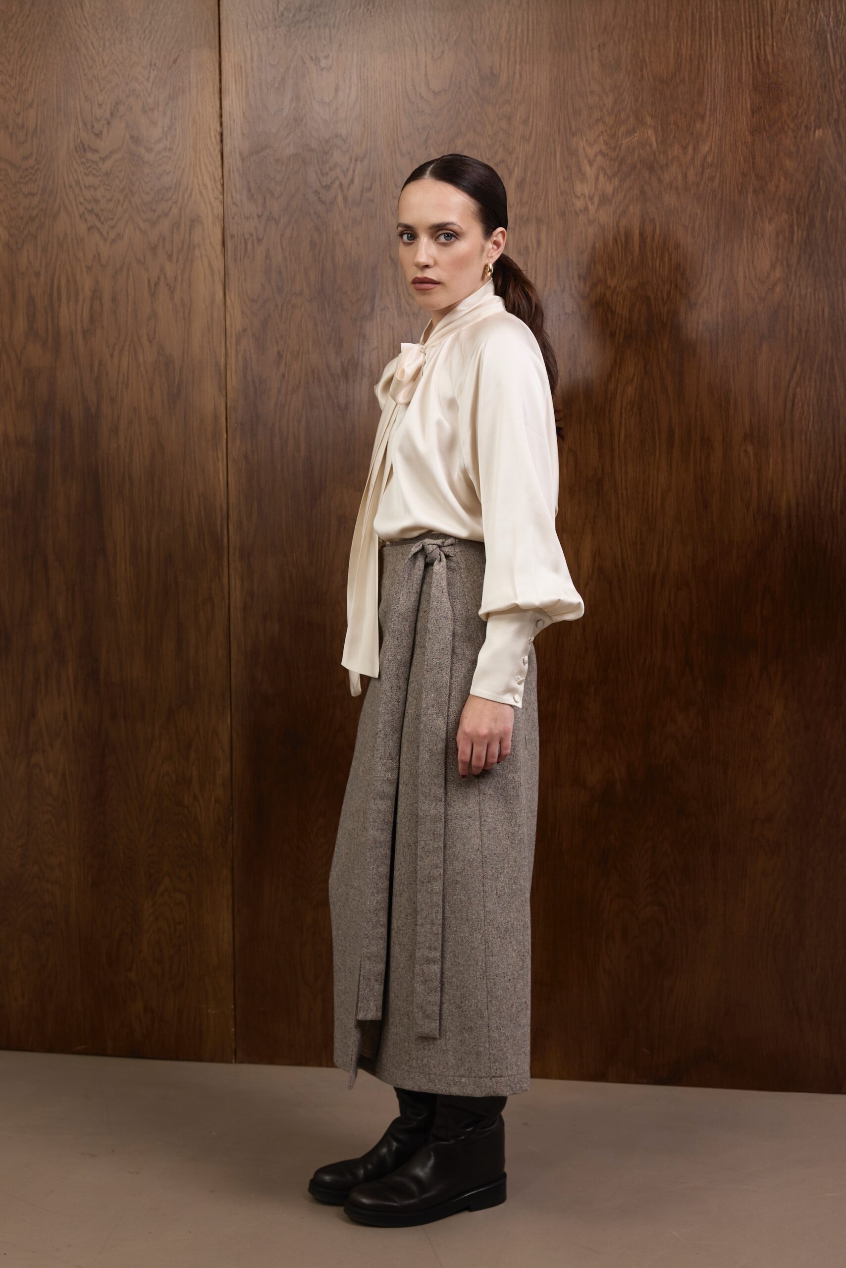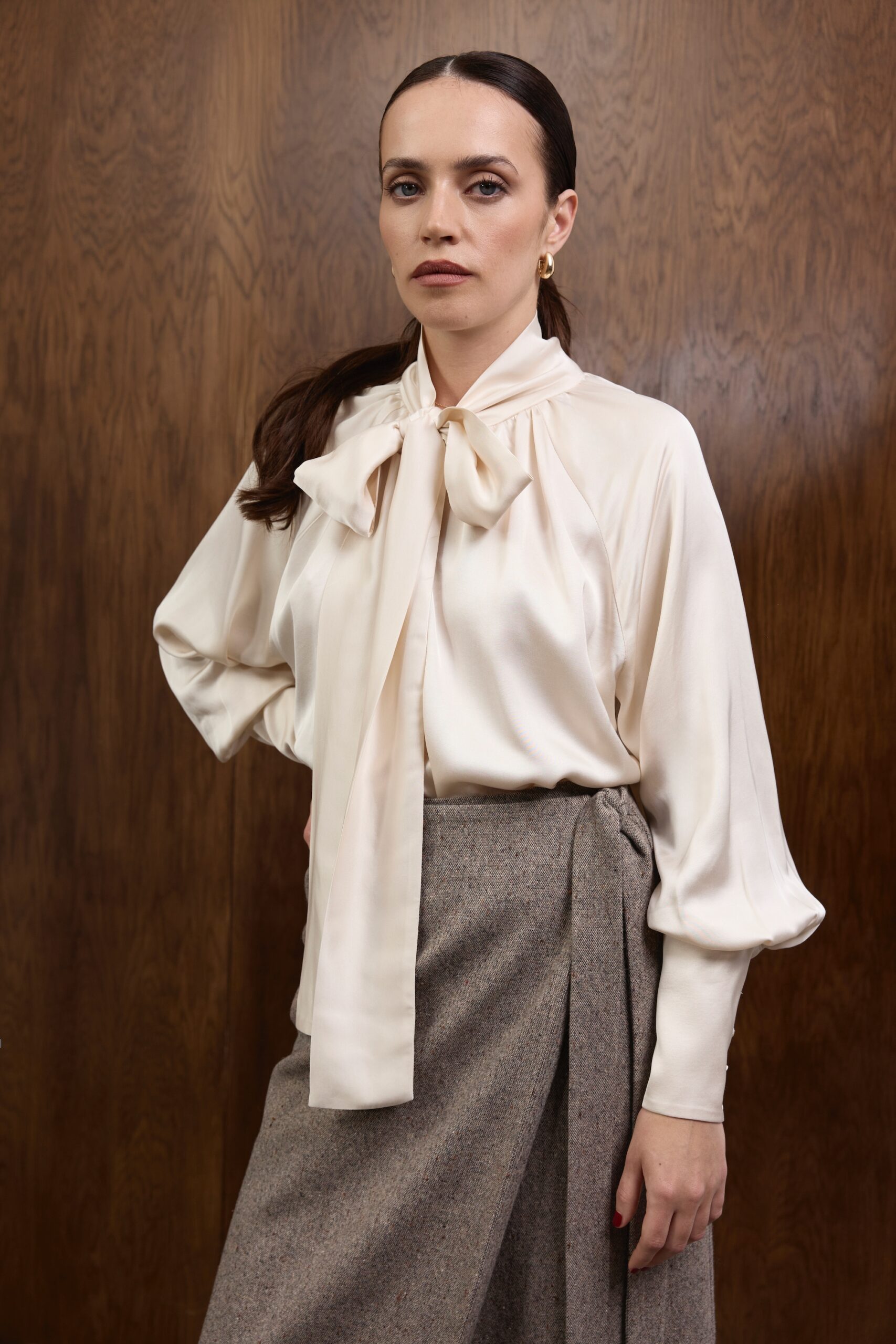 Raglanowe rękawy zakończone są mankietami z obciąganymi materiałem guzikami — eleganckim, couture’owym wykończeniem, które dopełnia całość w duchu ponadczasowego luksusu. Koszula doskonale prezentuje się zarówno w stylizacjach wieczorowych, jak i w dziennych zestawach z wełnianymi spodniami czy spódnicami z kolekcji.