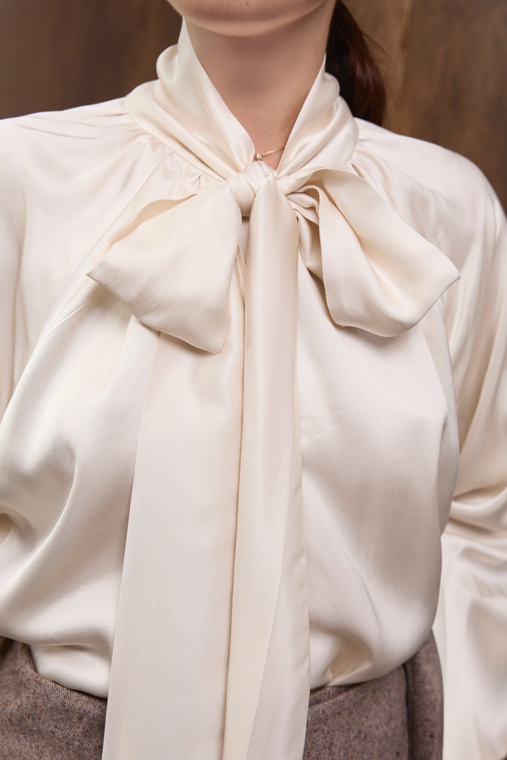 Satynowa koszula w ciepłym odcieniu ecru to esencja wyrafinowanej prostoty i zmysłowej elegancji. Miękka, płynnie układająca się tkanina pięknie odbija światło, podkreślając szlachetny charakter modelu, a subtelne marszczenia wokół dekoltu nadają mu miękką, kobiecą linię.