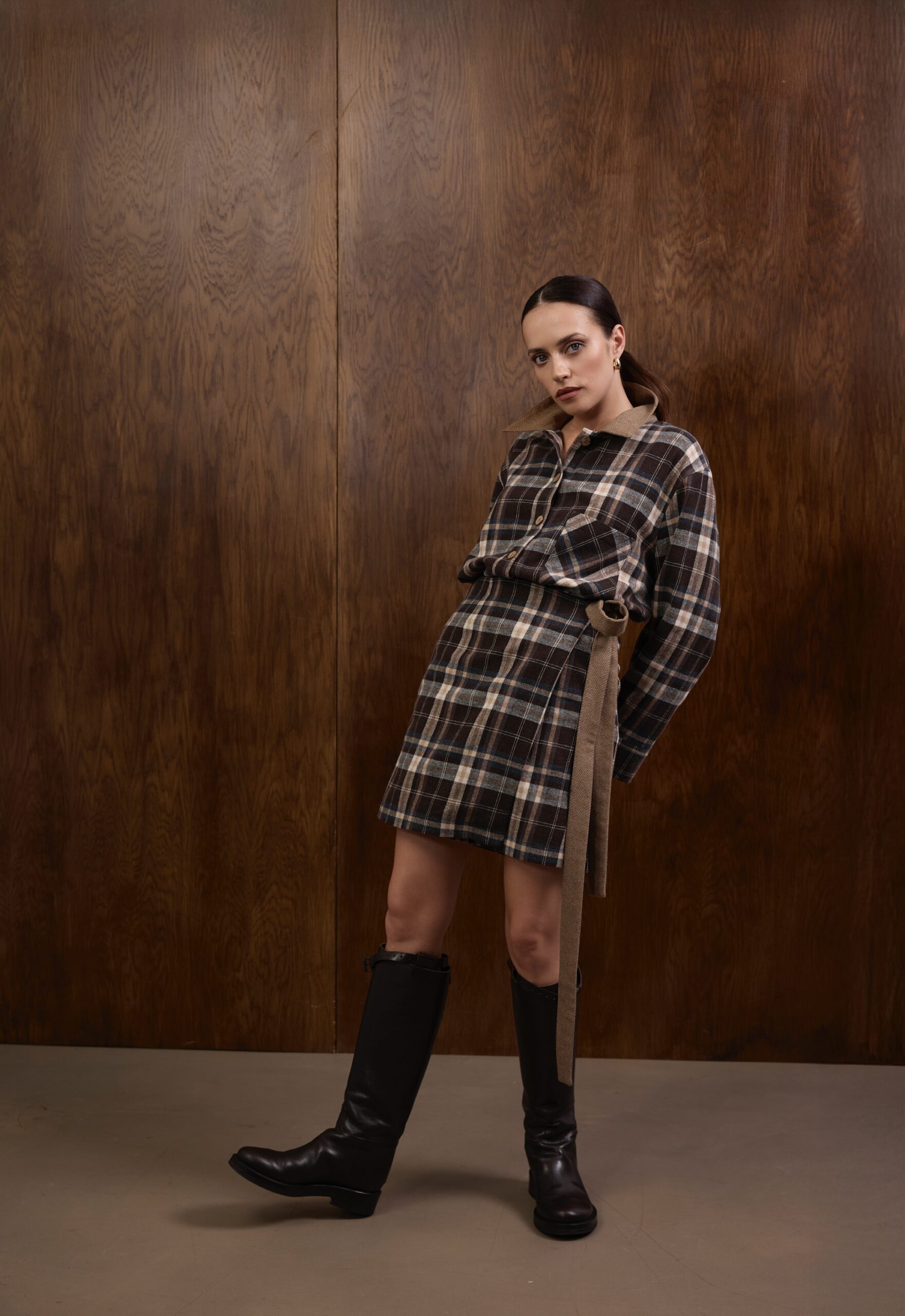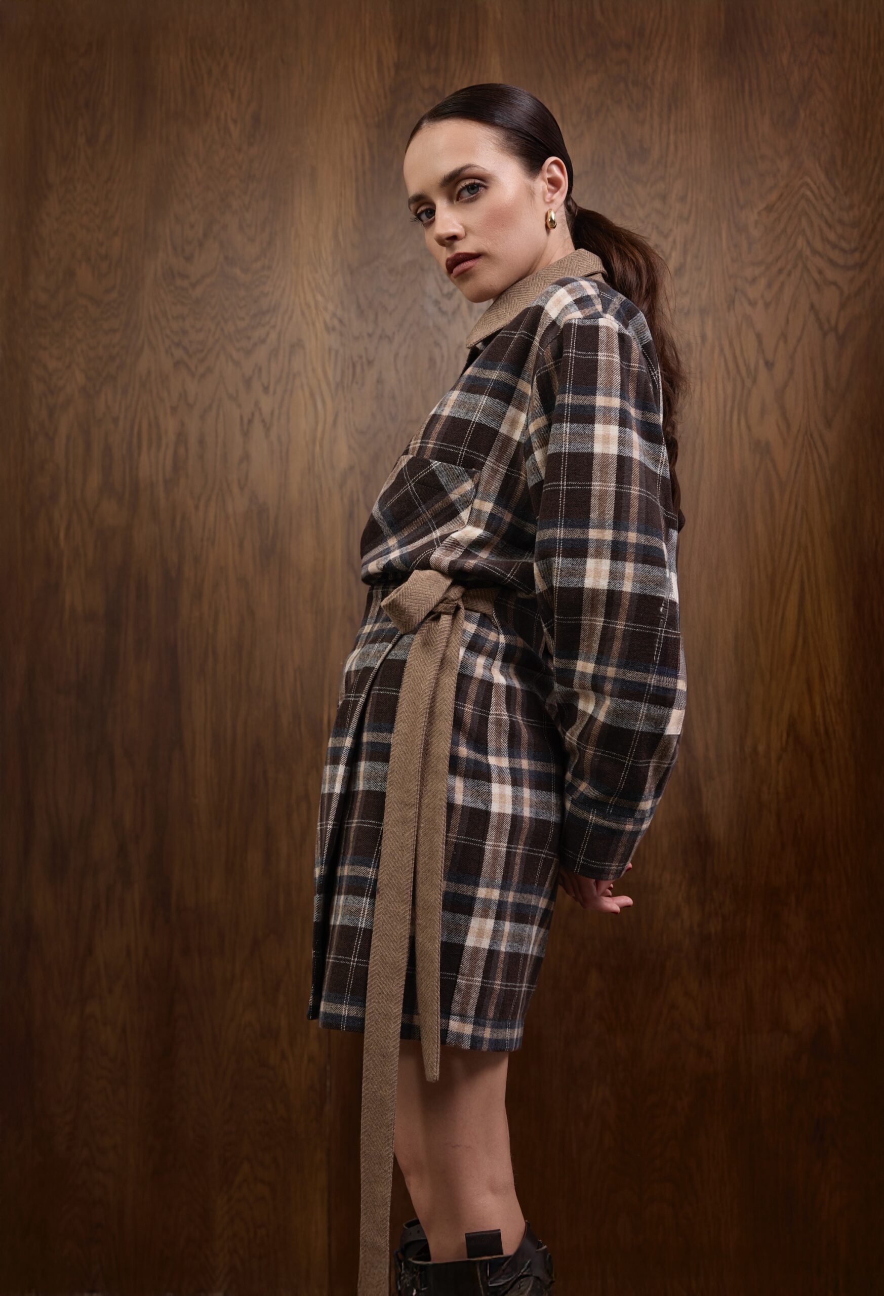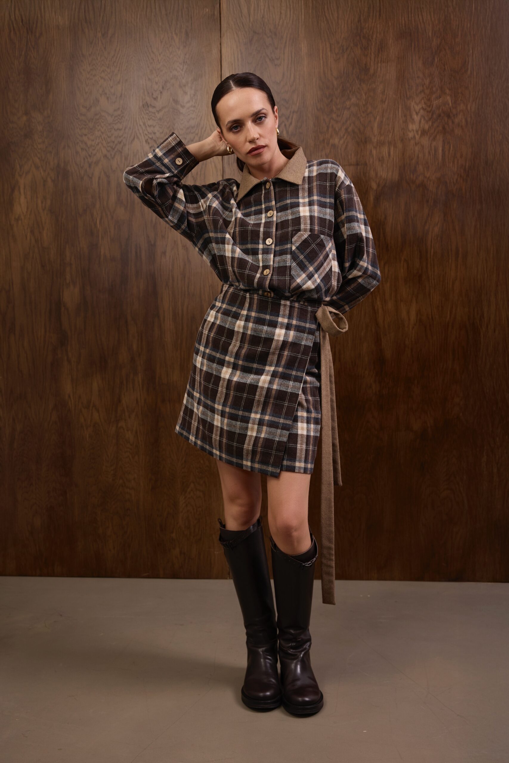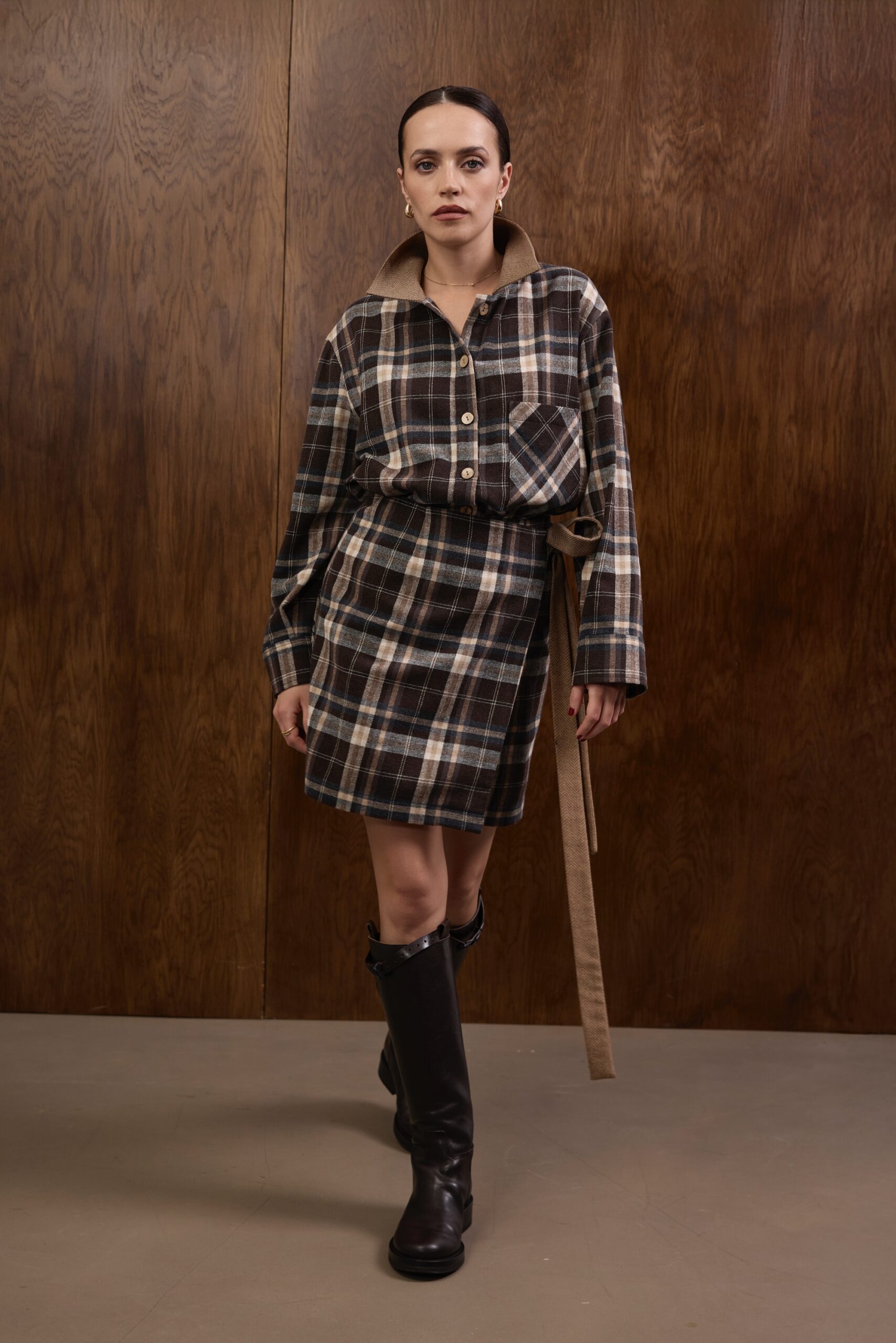 Mini spódnica została uszyta z tej samej, wyjątkowo przyjemnej w dotyku flaneli co koszula HARLINGTON, tworząc razem nowoczesny, koordynowany komplet wpisujący się w najważniejsze trendy sezonu. Klasyczny wzór kratę zyskuje tu świeże, miejskie oblicze, a prosty krój podkreślony wiązaniem w talii pozwala dopasować fason do sylwetki i nadać stylizacji lekkości.