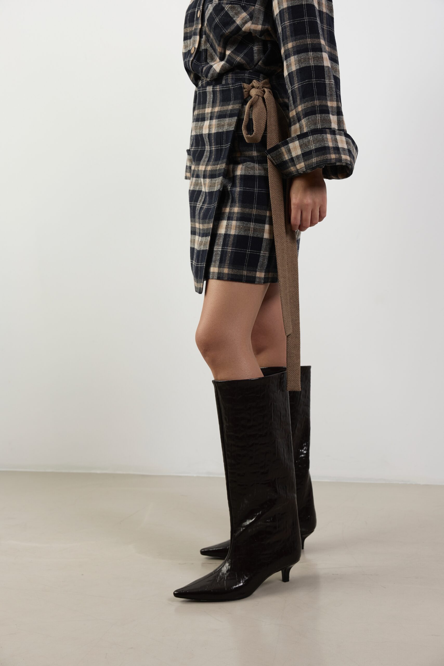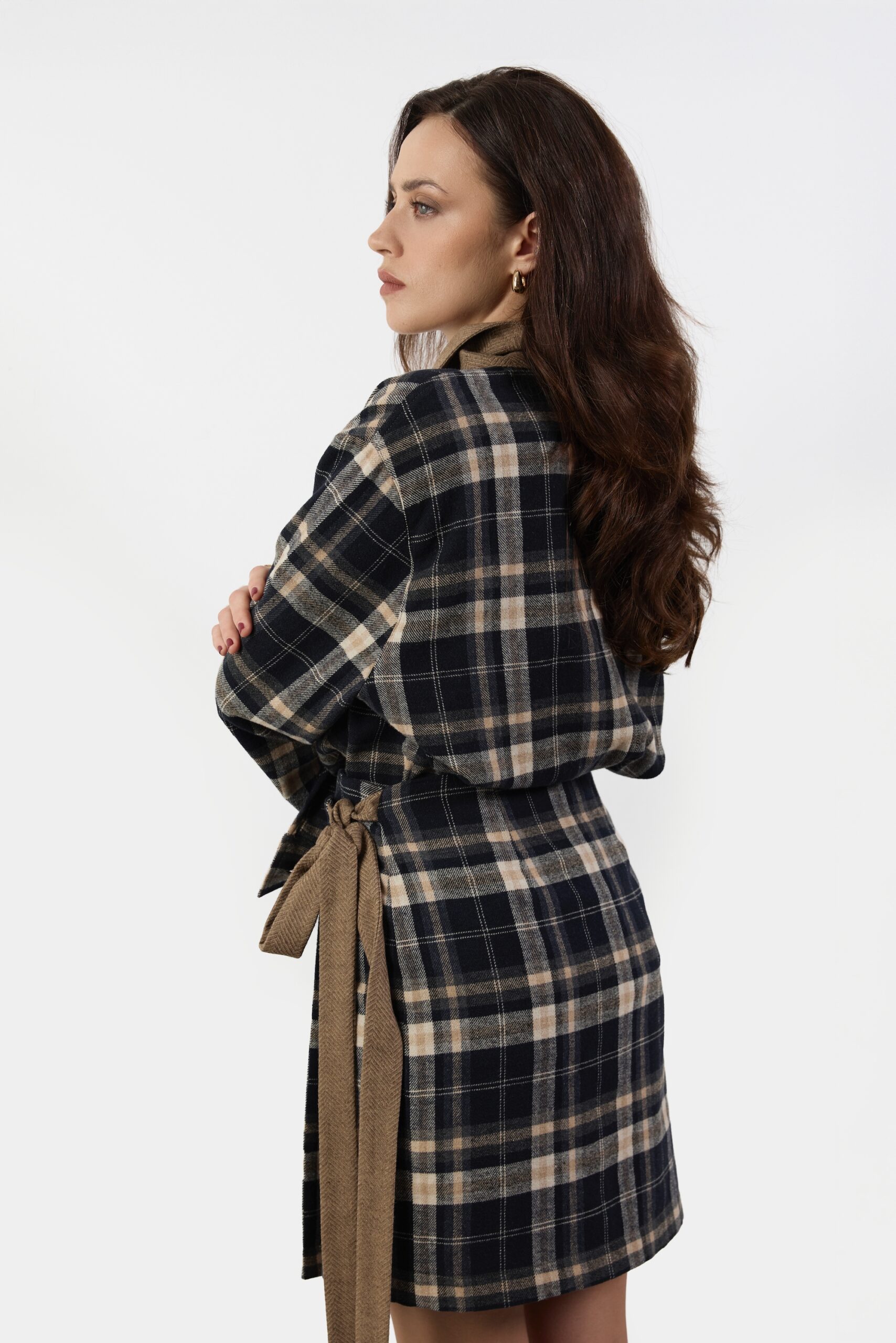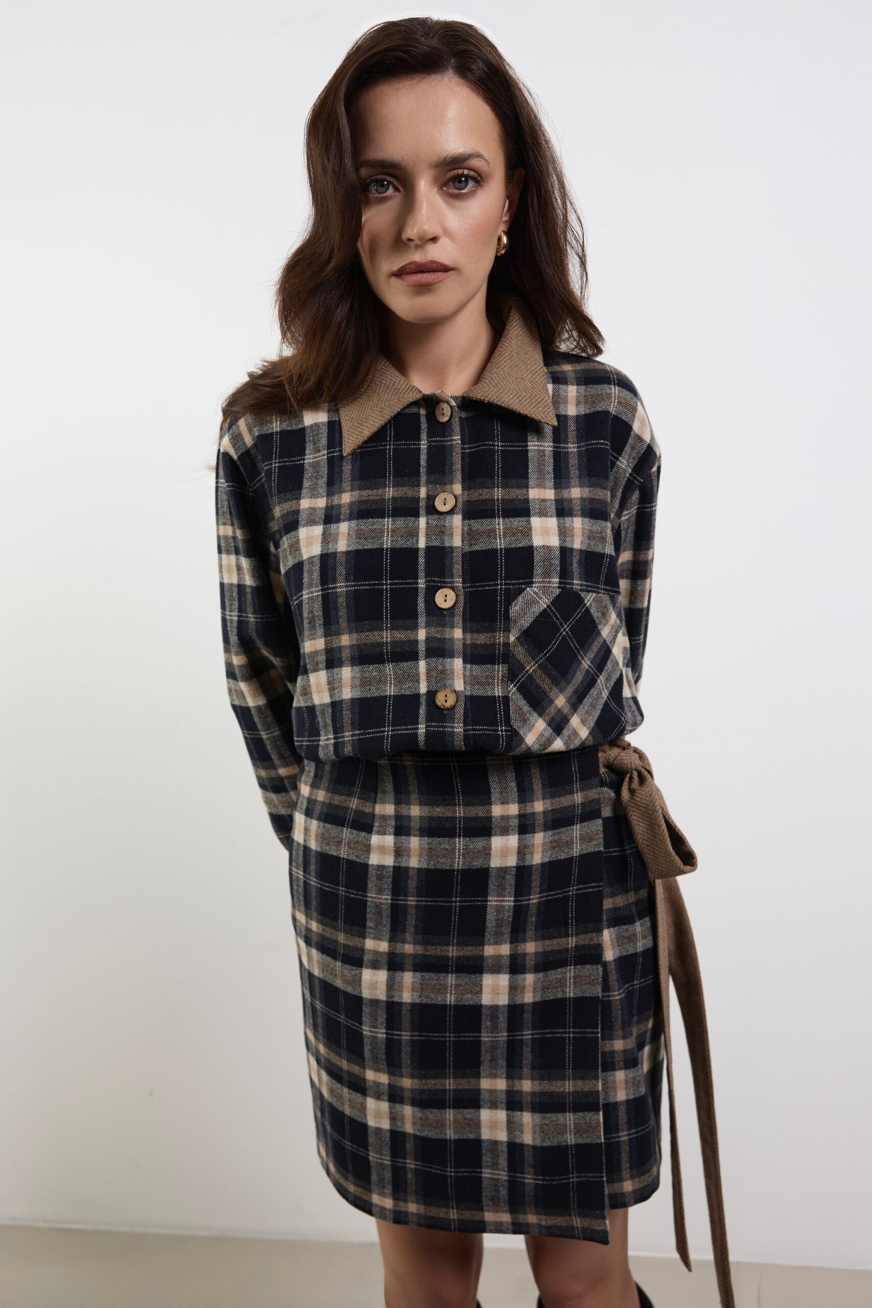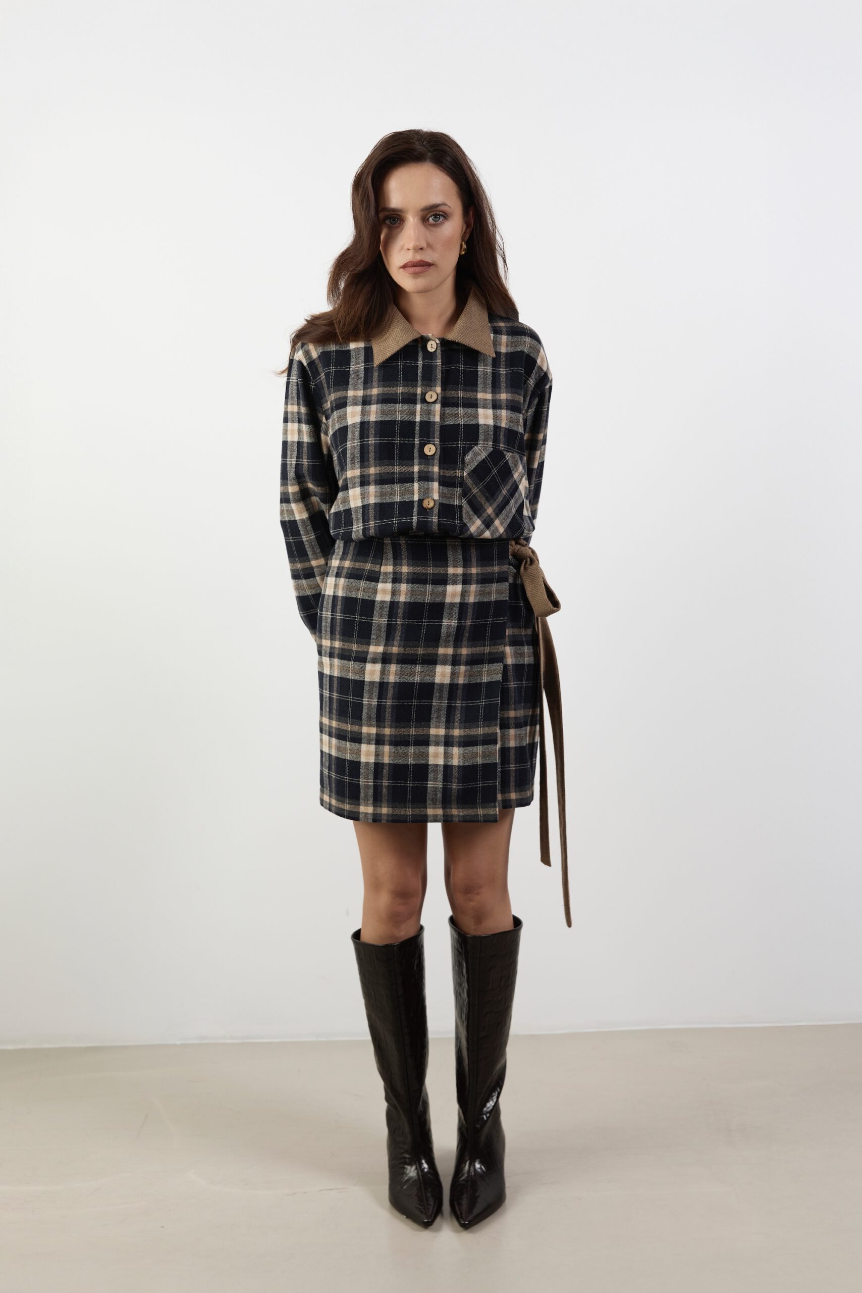 Mini spódnica została uszyta z tej samej, wyjątkowo przyjemnej w dotyku flaneli co koszula HARLINGTON, tworząc razem nowoczesny, koordynowany komplet wpisujący się w najważniejsze trendy sezonu. Klasyczny wzór kratę zyskuje tu świeże, miejskie oblicze, a prosty krój podkreślony wiązaniem w talii pozwala dopasować fason do sylwetki i nadać stylizacji lekkości.