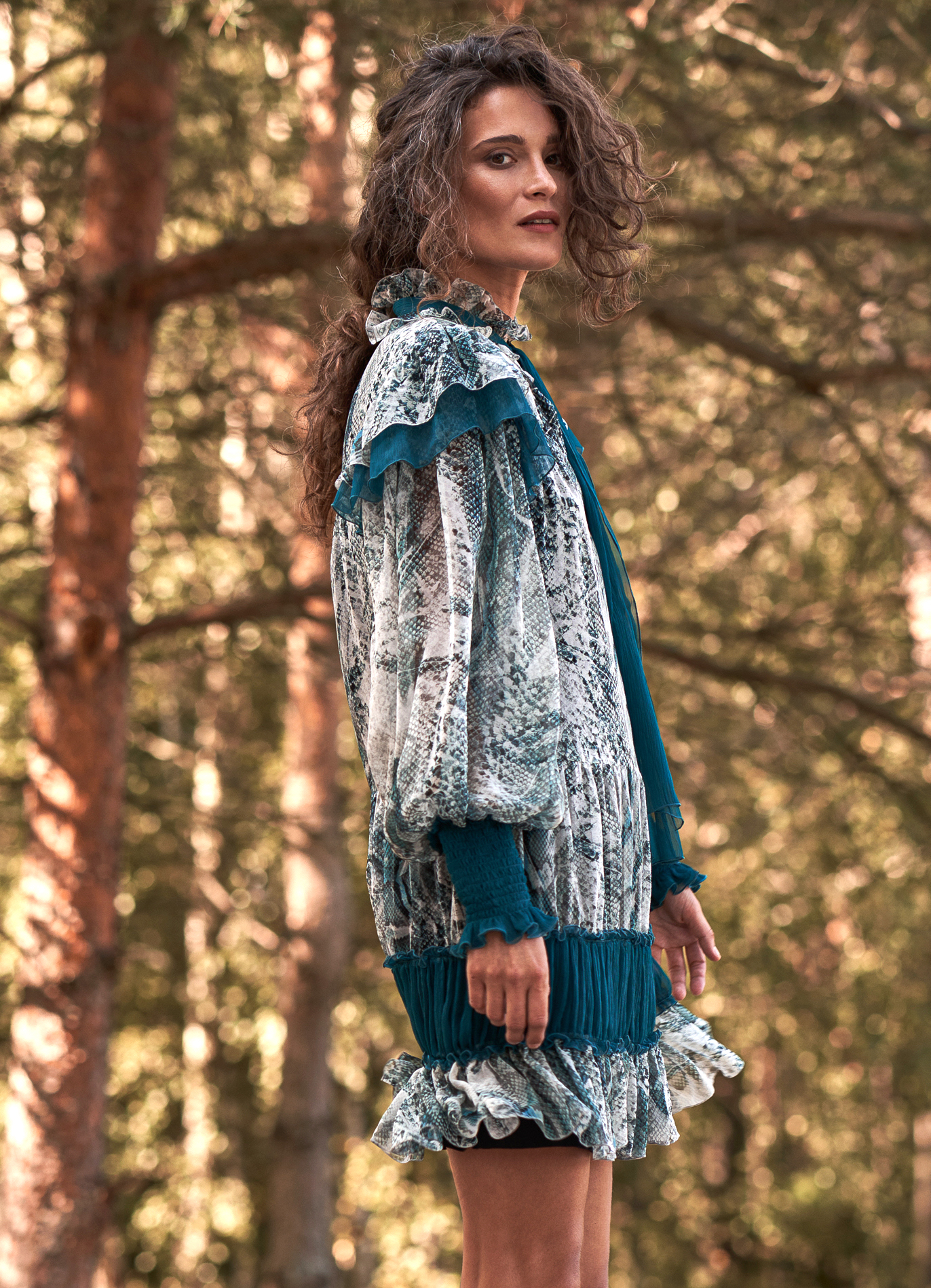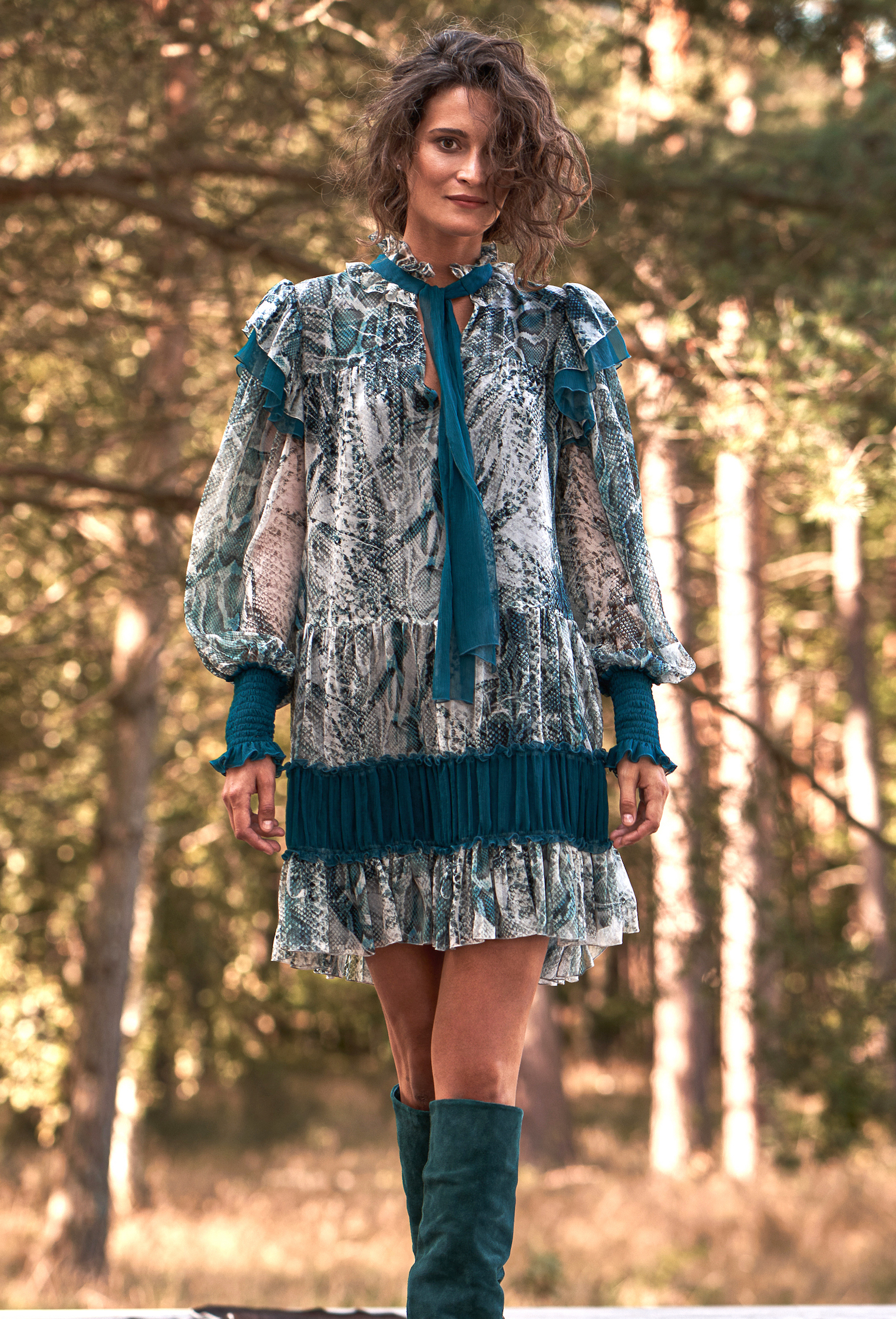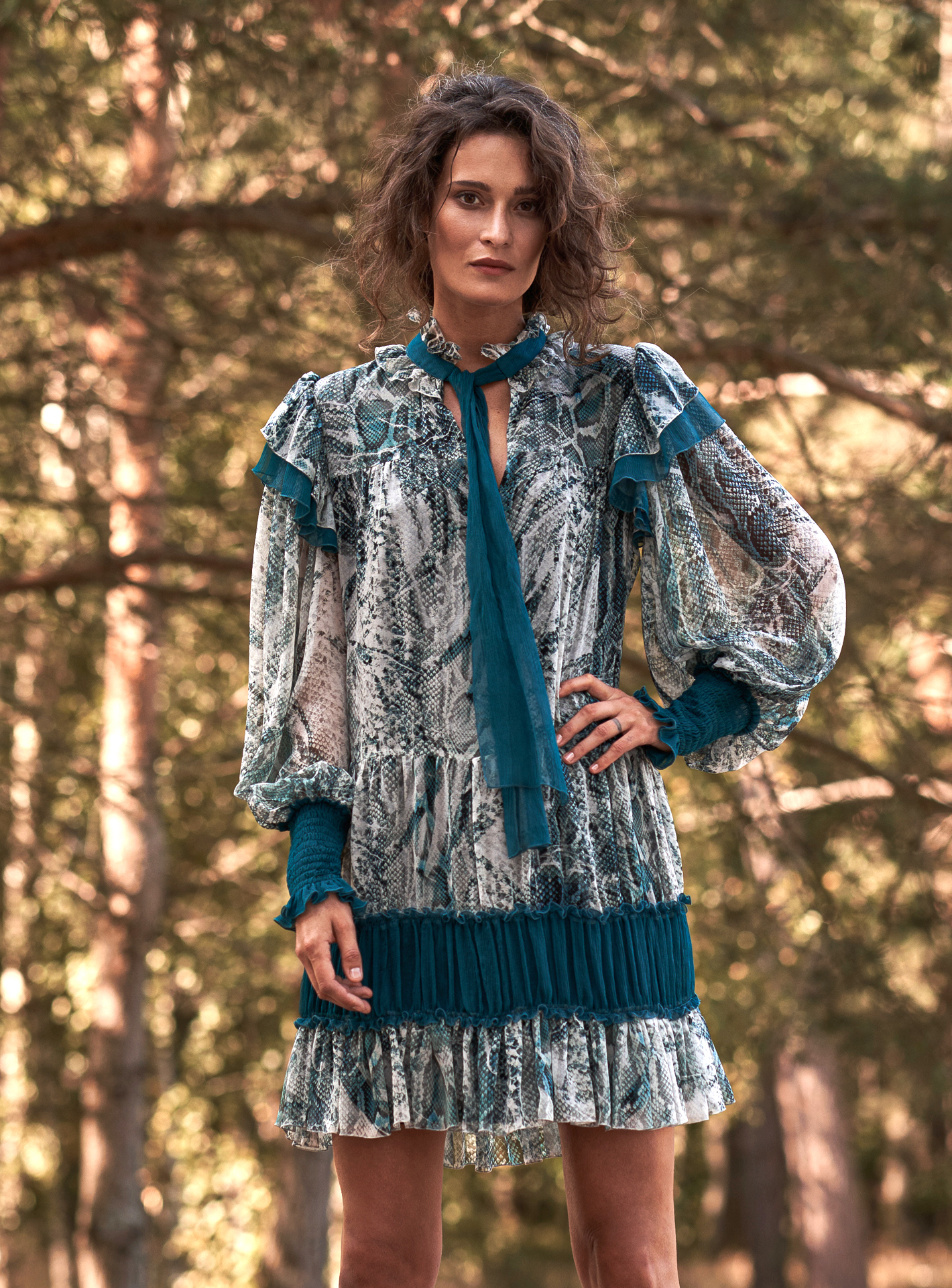 Ta jedwabna sukienka emanuje lekkością i wyrazistym charakterem dzięki połączeniu efektownego, inspirowanego naturą printu i głębokich turkusowych akcentów. Model zachwyca kobiecym, swobodnym krojem z delikatnymi falbanami oraz dekoracyjną wstążką przy dekolcie. Bufiaste rękawy zakończone szerokimi, marszczonymi mankietami podkreślają elegancję całości, a kontrastowe jedwabne wstawki nadają sylwetce lekkości i harmonii. To sukienka, która przyciąga wzrok, a jednocześnie pozostaje niezwykle komfortowa – idealna na wyjątkowe okazje, wieczorne wyjścia czy eleganckie spotkania.