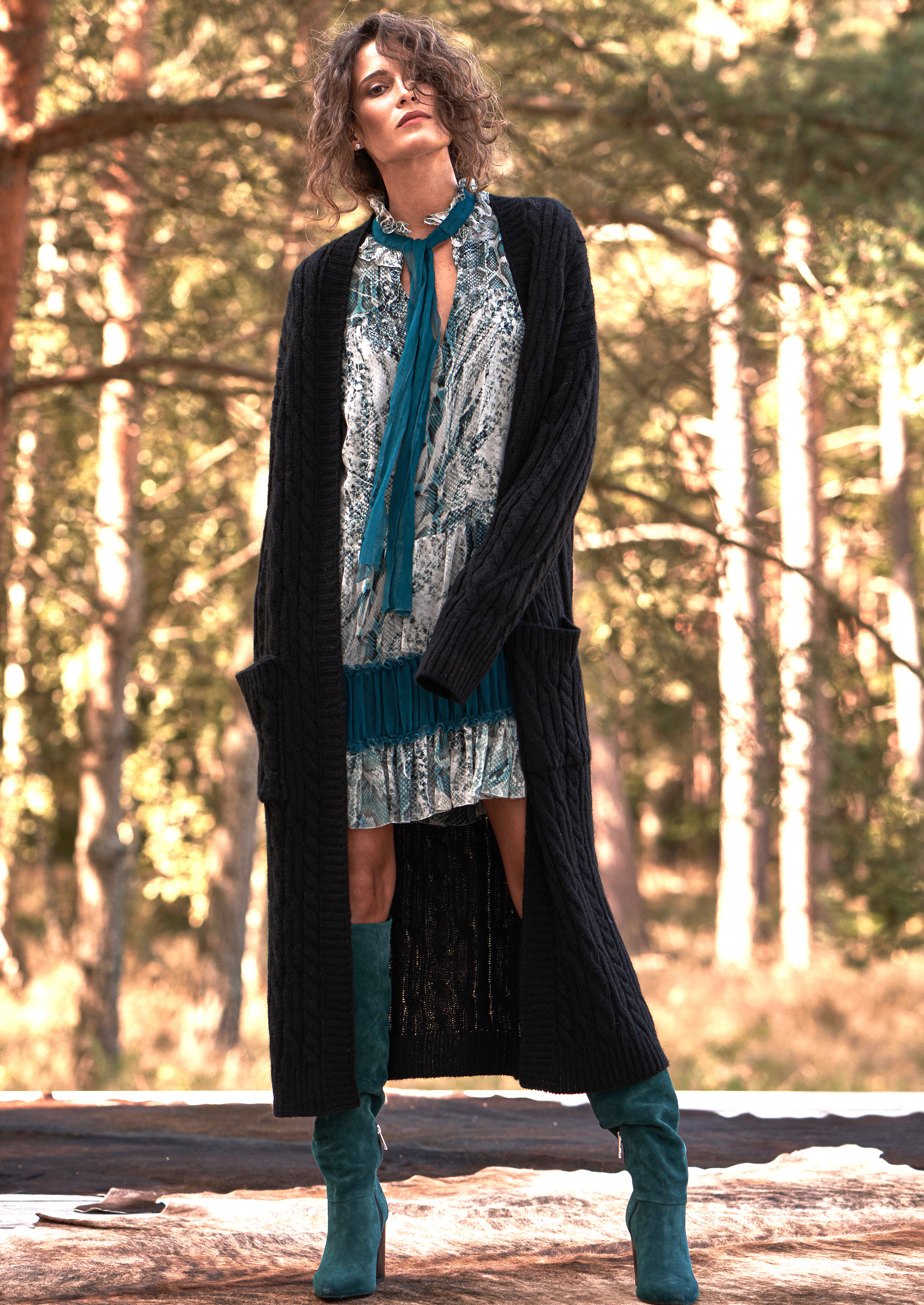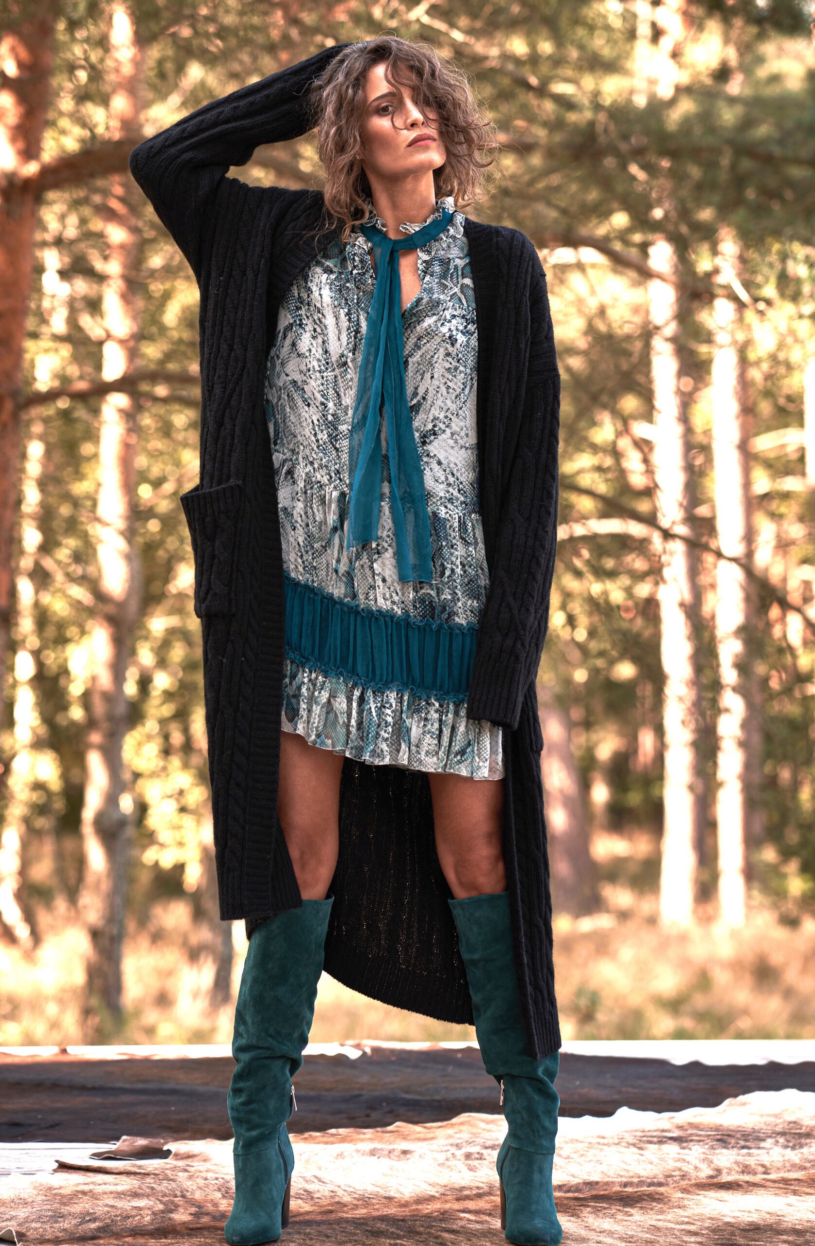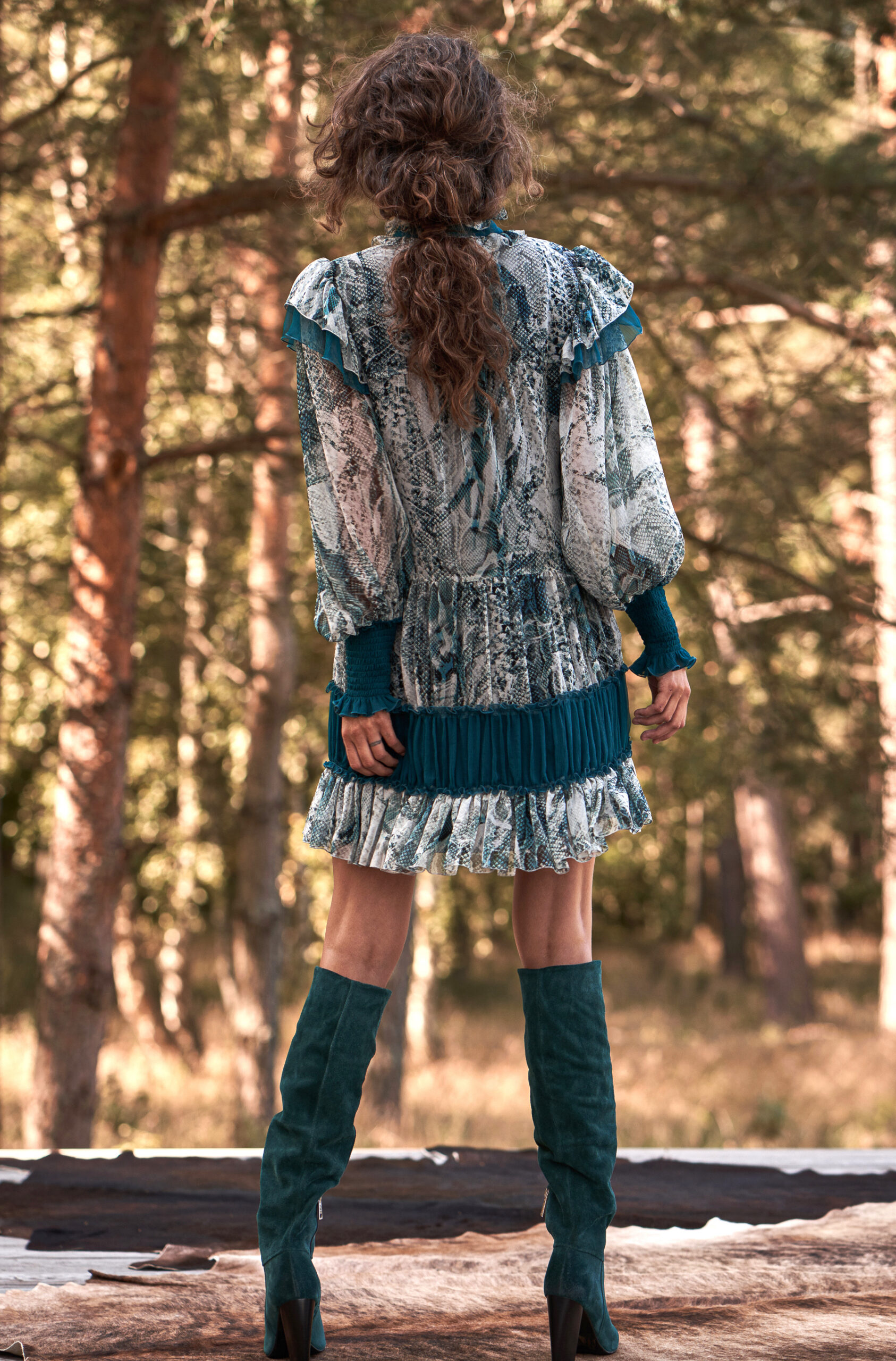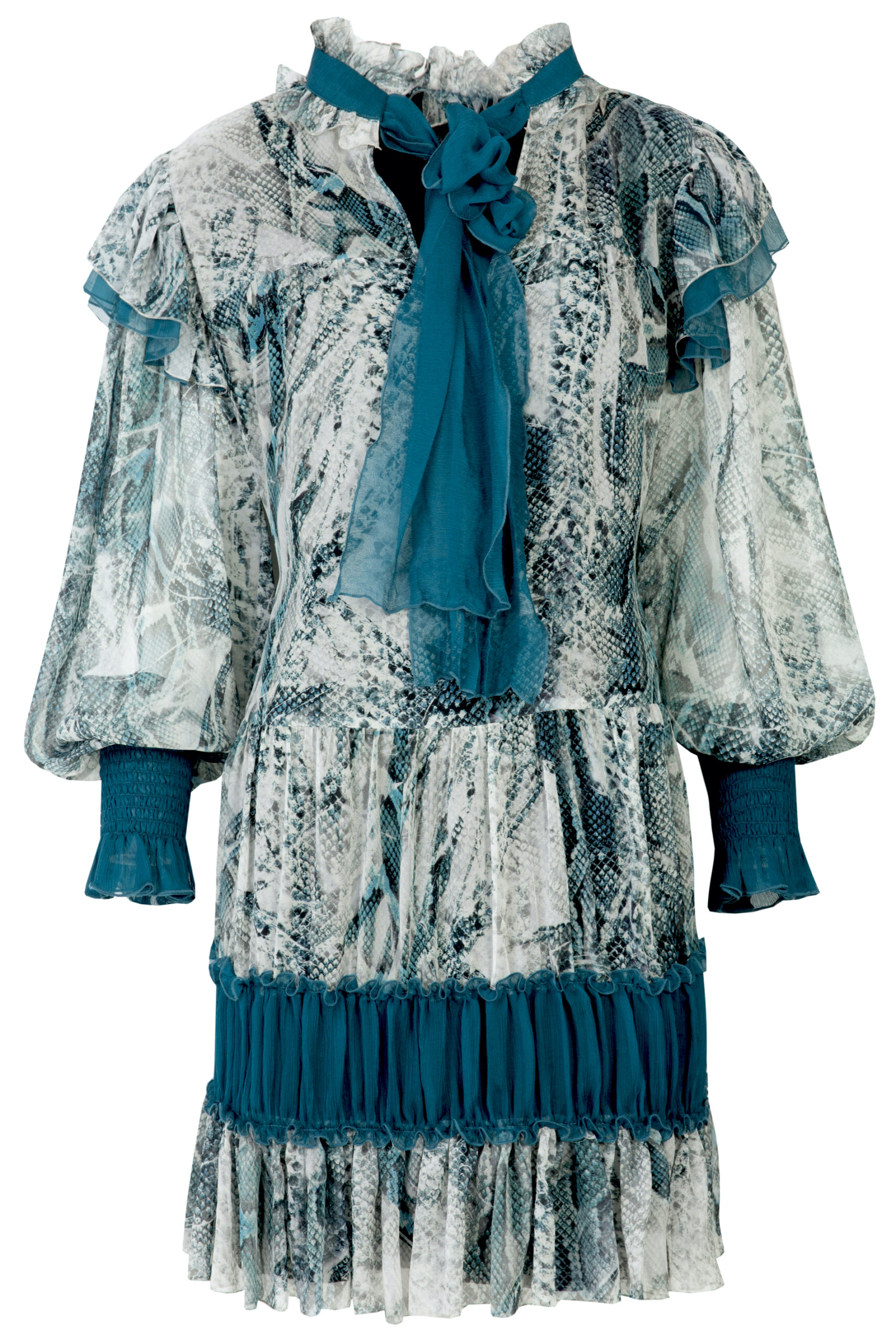 Ta jedwabna sukienka emanuje lekkością i wyrazistym charakterem dzięki połączeniu efektownego, inspirowanego naturą printu i głębokich turkusowych akcentów. Model zachwyca kobiecym, swobodnym krojem z delikatnymi falbanami oraz dekoracyjną wstążką przy dekolcie. Bufiaste rękawy zakończone szerokimi, marszczonymi mankietami podkreślają elegancję całości, a kontrastowe jedwabne wstawki nadają sylwetce lekkości i harmonii. To sukienka, która przyciąga wzrok, a jednocześnie pozostaje niezwykle komfortowa – idealna na wyjątkowe okazje, wieczorne wyjścia czy eleganckie spotkania.