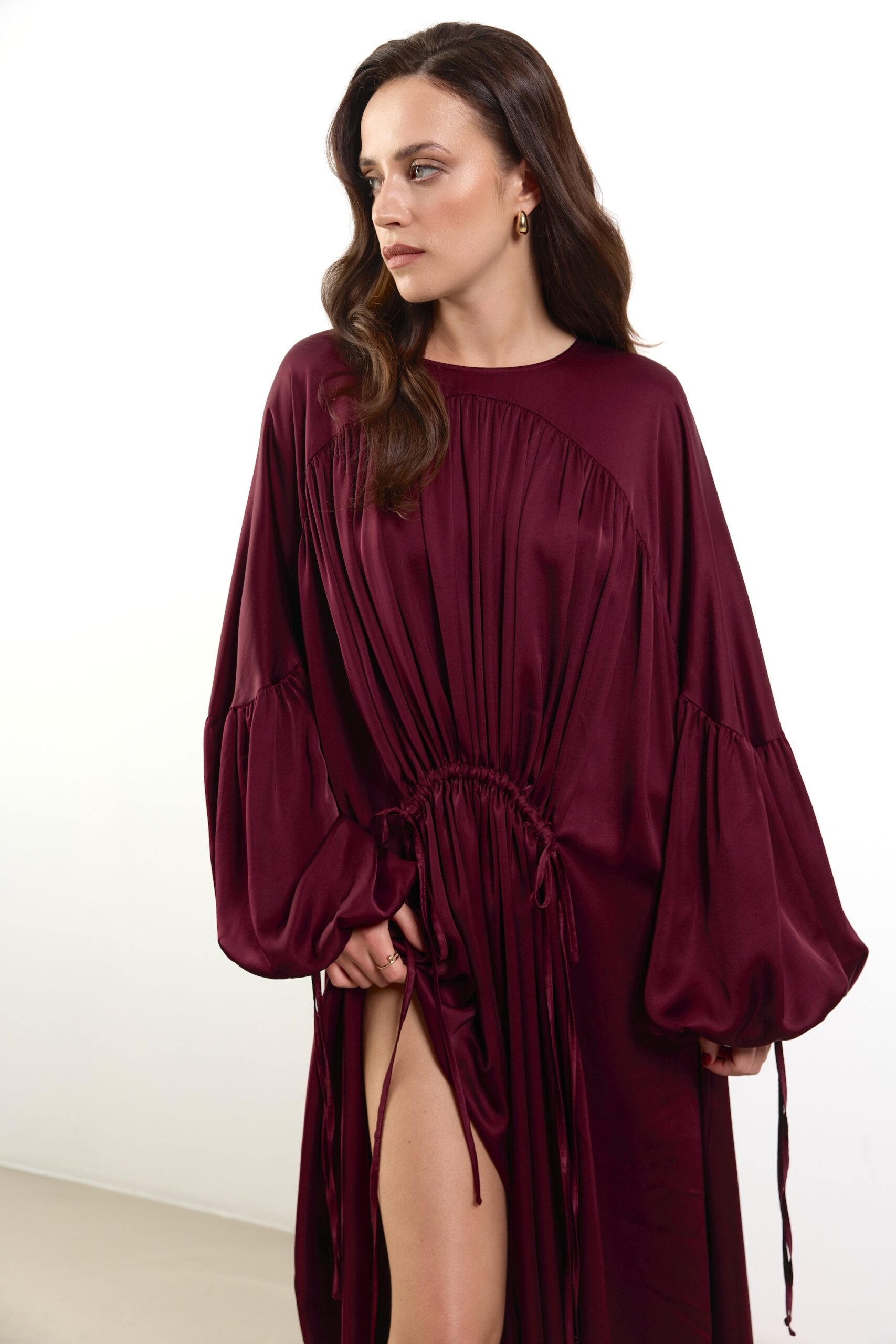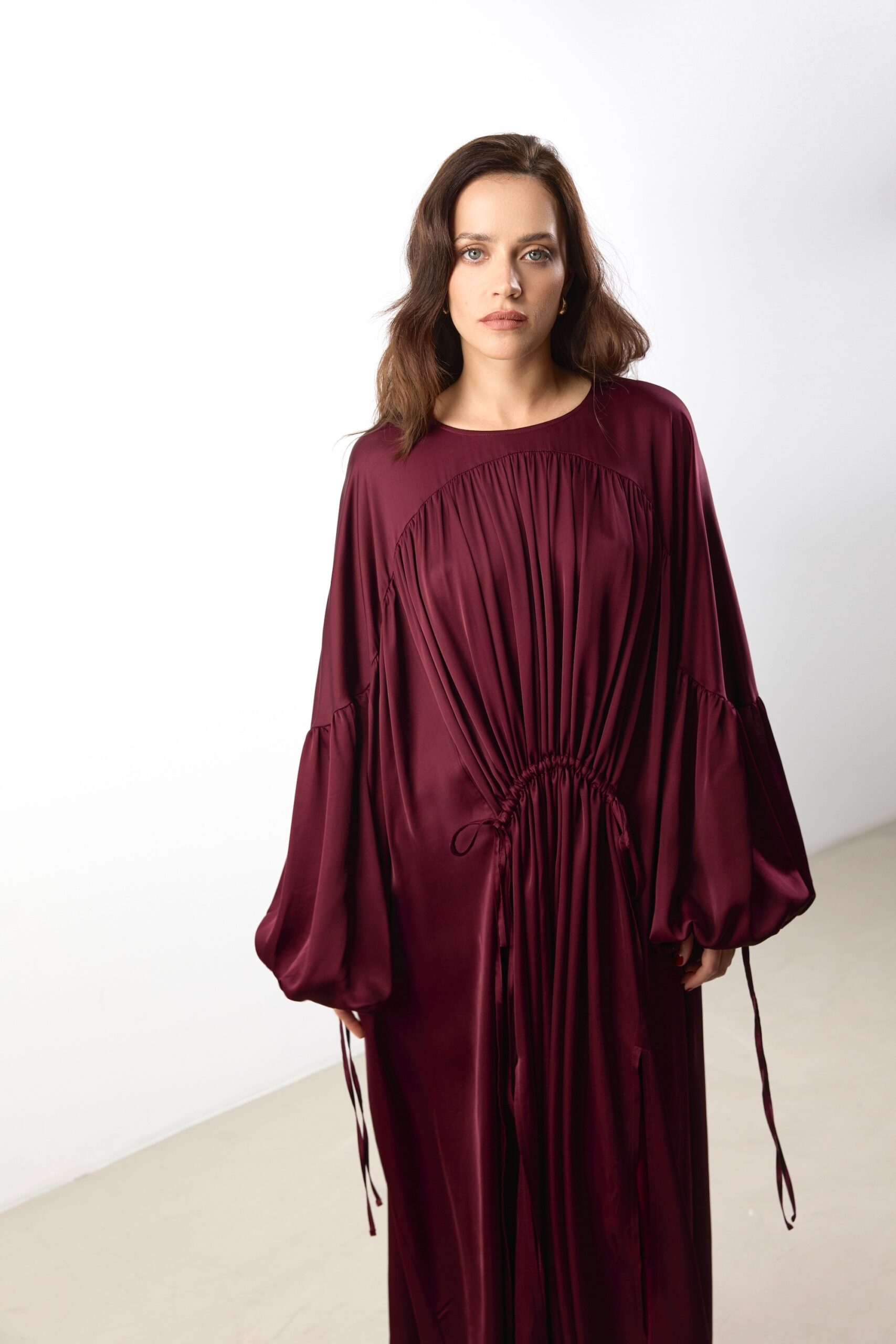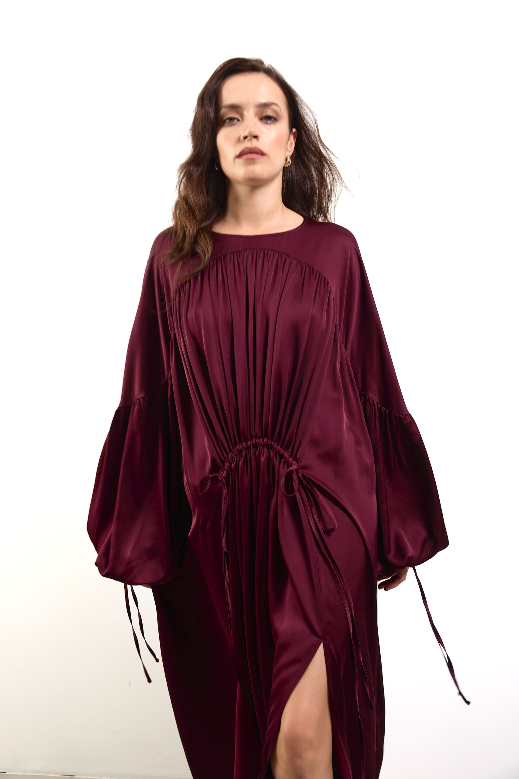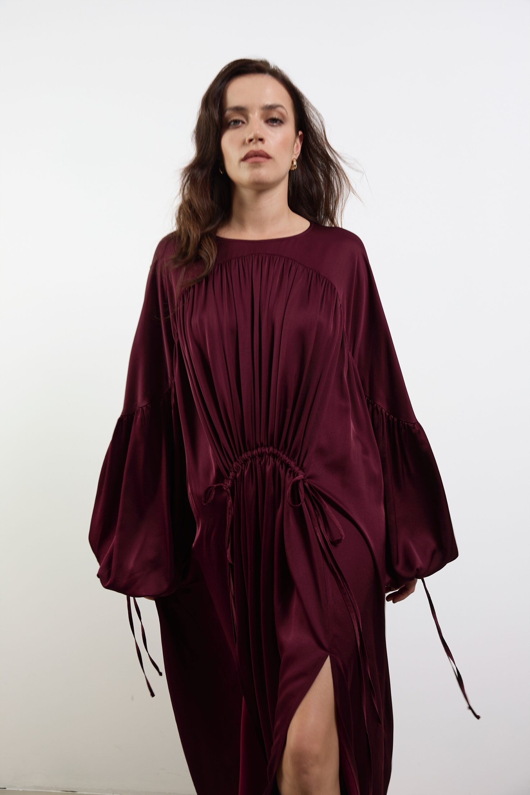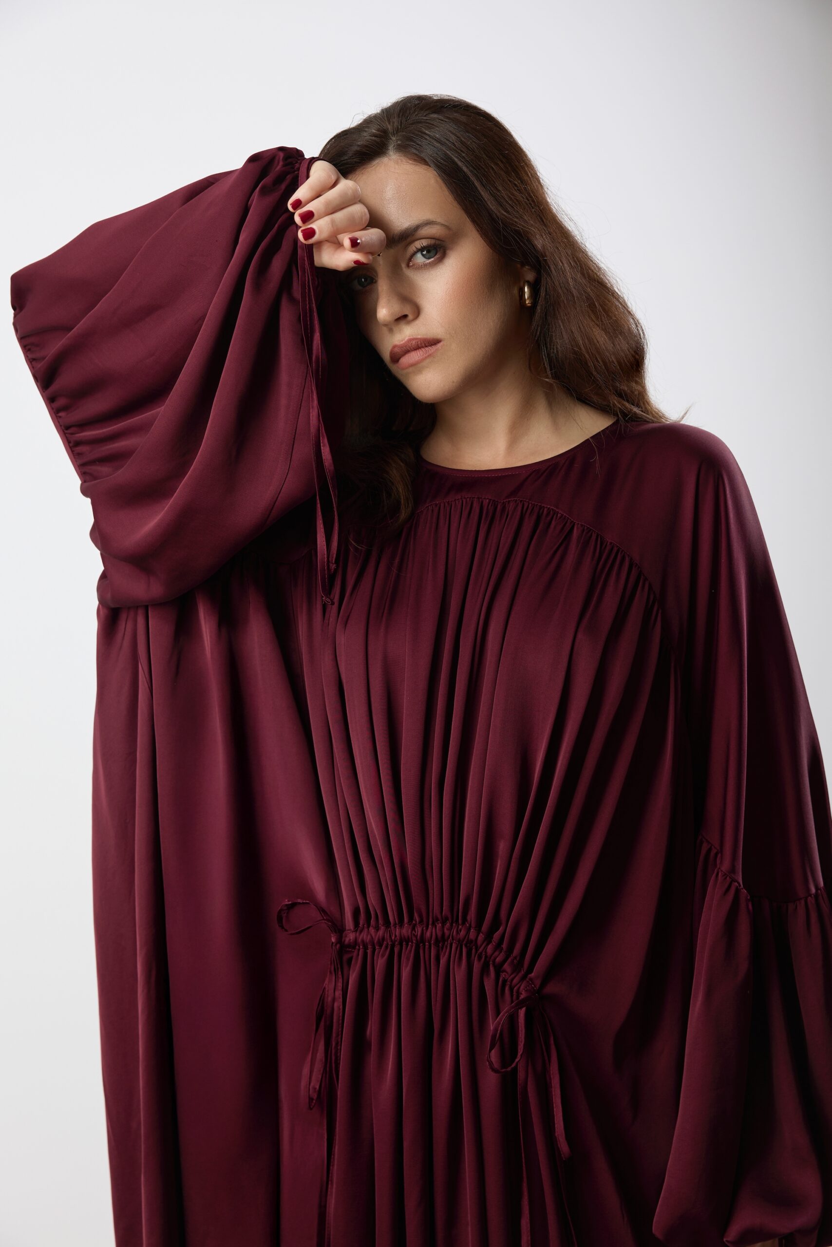 Ta sukienka zachwyca swoim płynnym, teatralnym ruchem i szlachetnym wykończeniem, które nadaje jej aurę nowoczesnej elegancji. Uszyta z miękkiej satyny w głębokim odcieniu burgundu, otula sylwetkę w sposób lekki i zmysłowy. Charakterystyczne marszczenie biegnące przez przód sukienki subtelnie modeluje kształt, tworząc miękkie, architektoniczne linie, które dodają całości wyrafinowania.