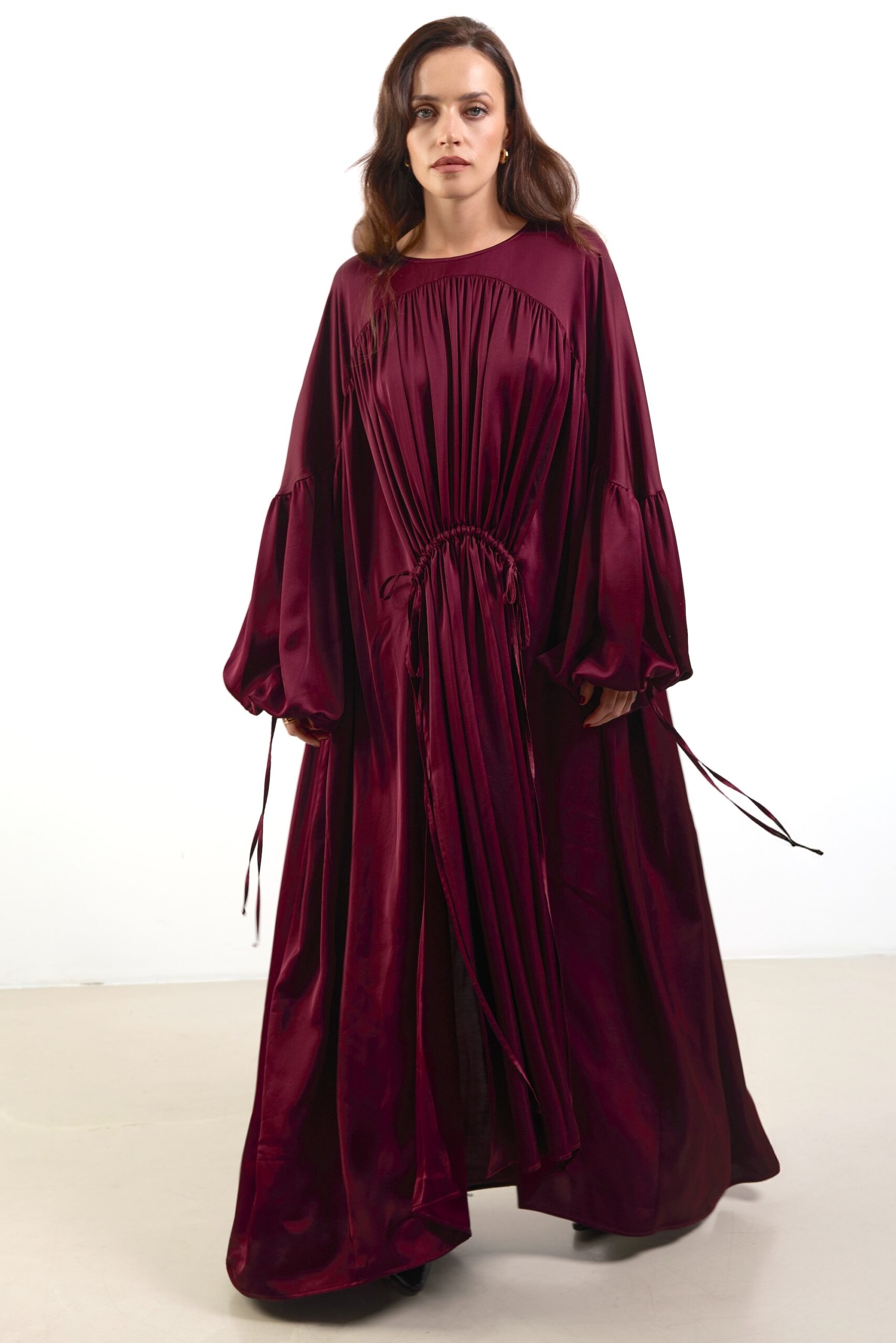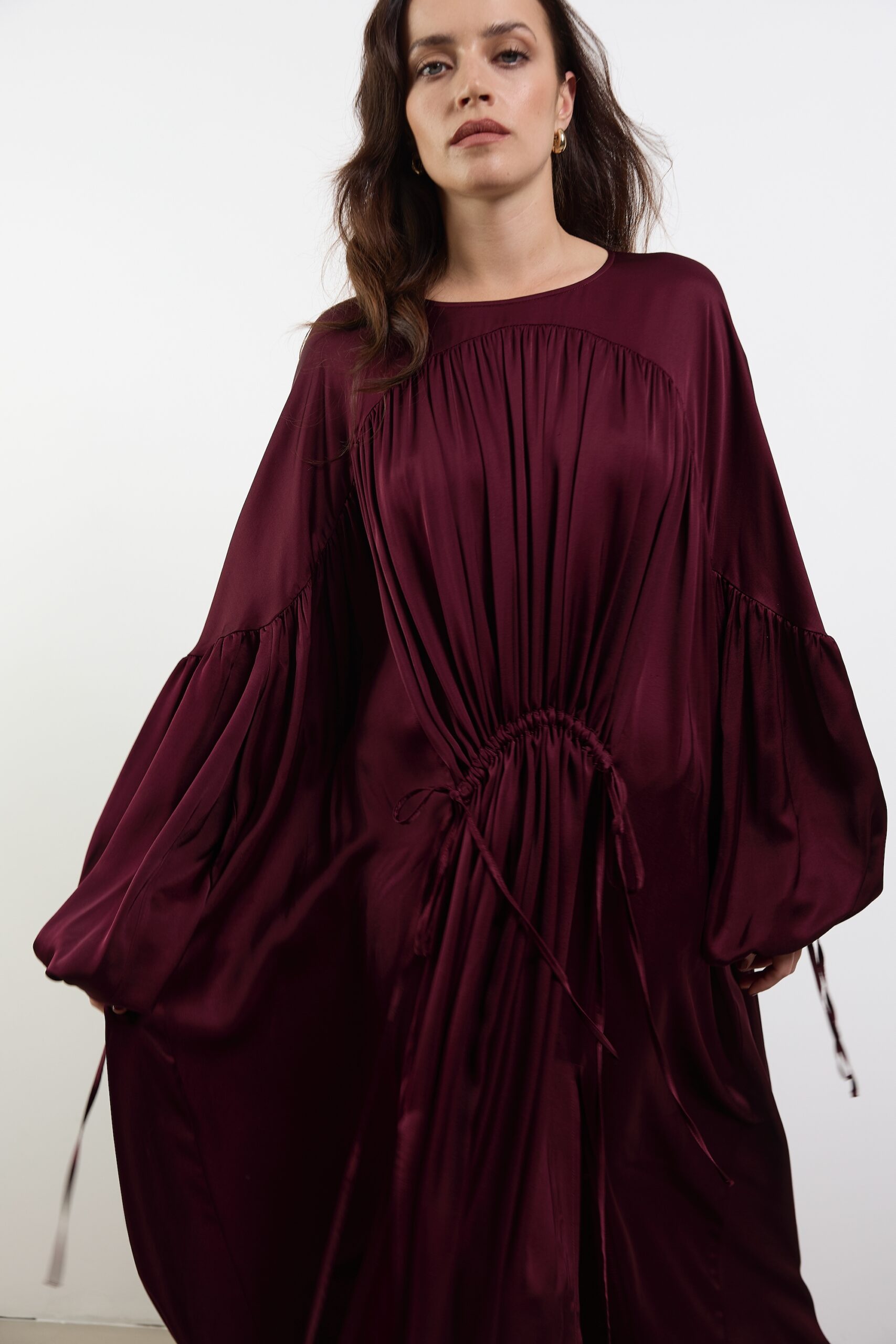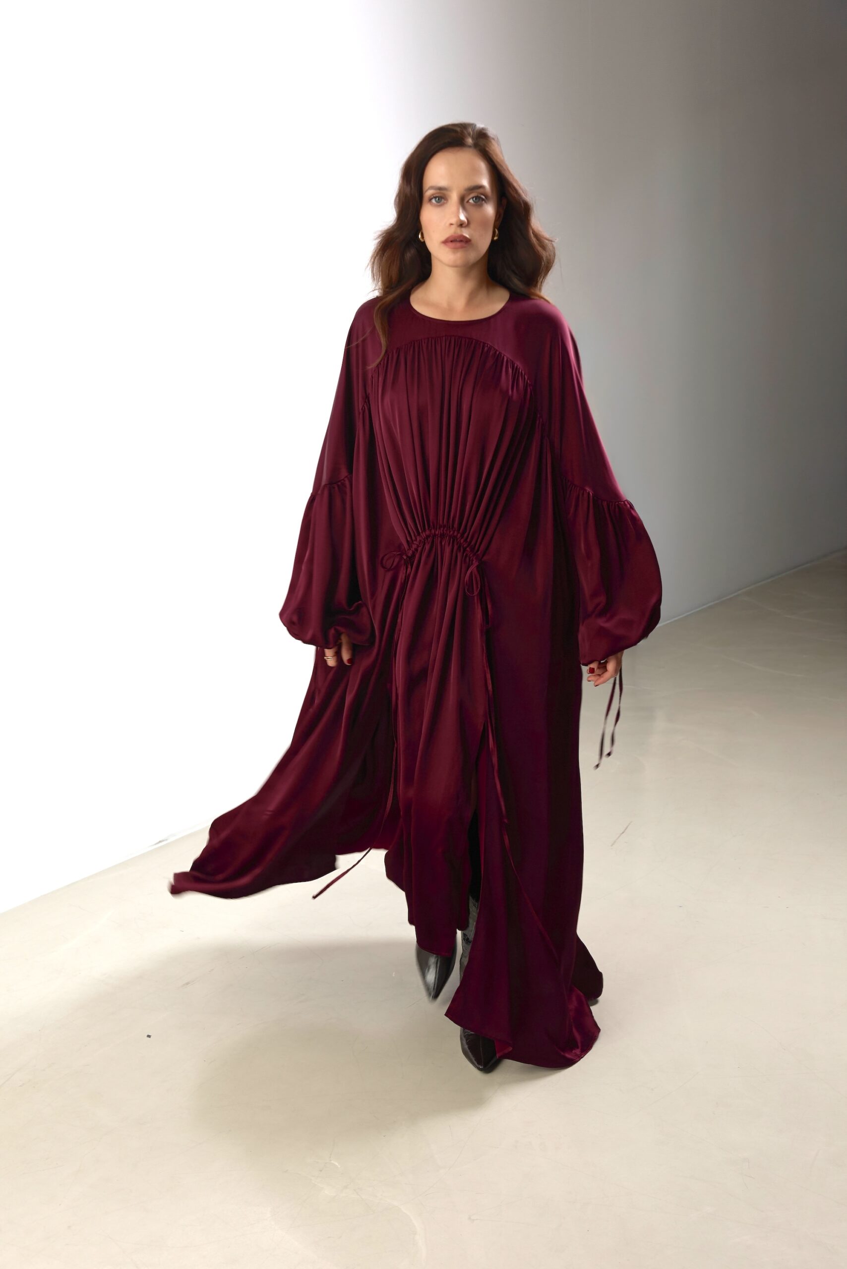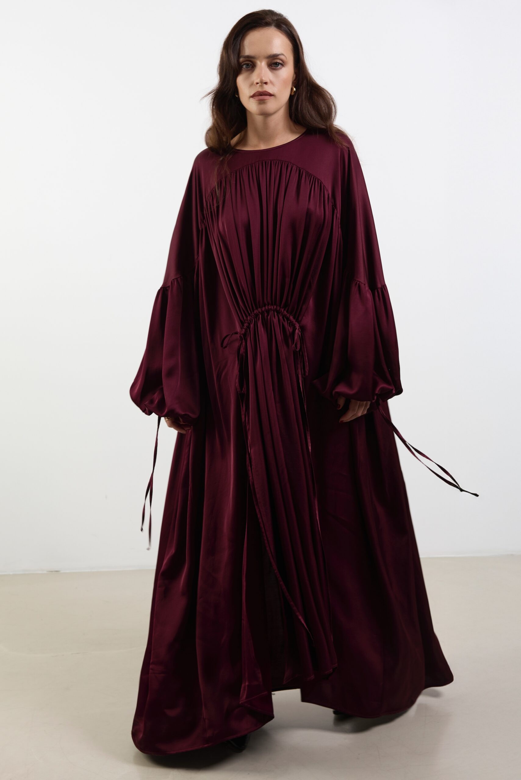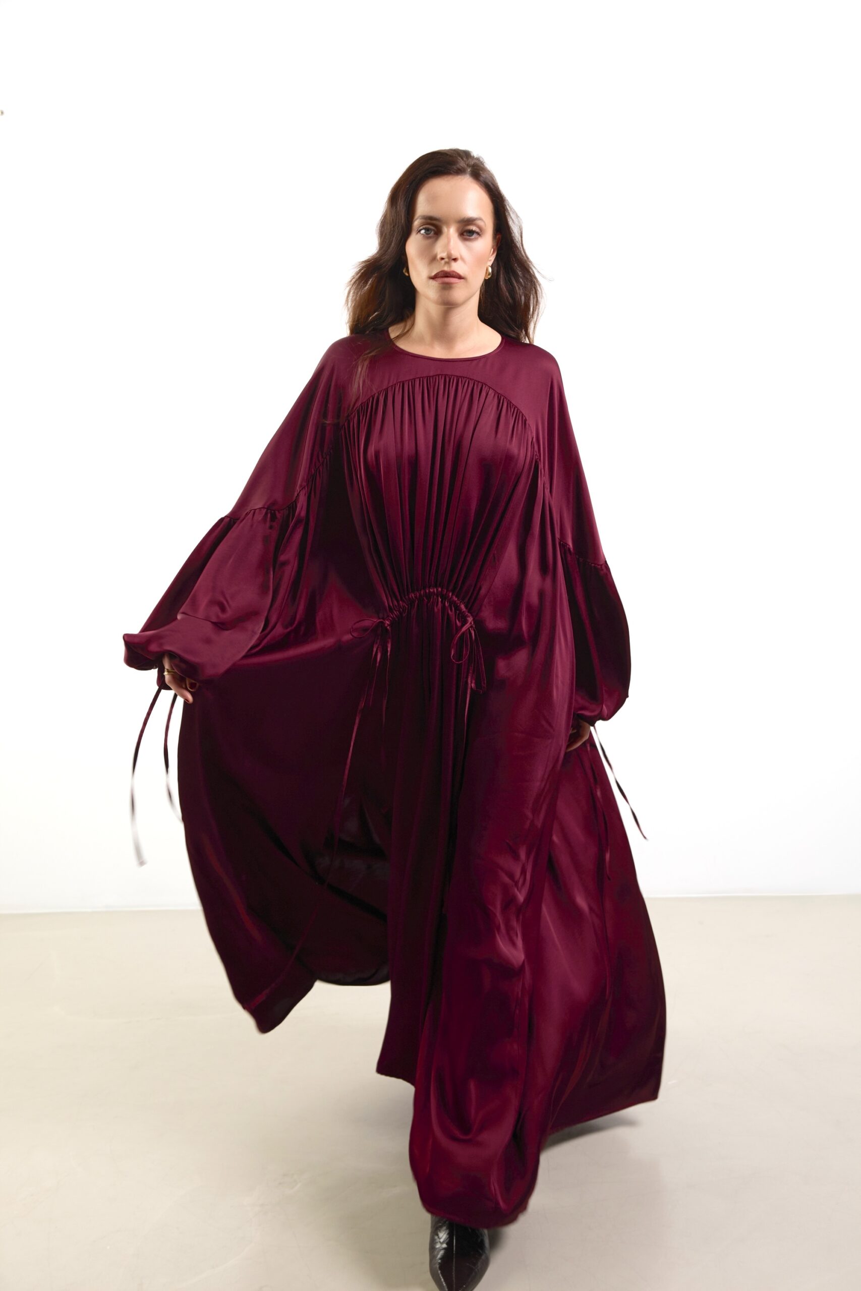 Ta sukienka zachwyca swoim płynnym, teatralnym ruchem i szlachetnym wykończeniem, które nadaje jej aurę nowoczesnej elegancji. Uszyta z miękkiej satyny w głębokim odcieniu burgundu, otula sylwetkę w sposób lekki i zmysłowy. Charakterystyczne marszczenie biegnące przez przód sukienki subtelnie modeluje kształt, tworząc miękkie, architektoniczne linie, które dodają całości wyrafinowania.