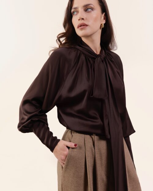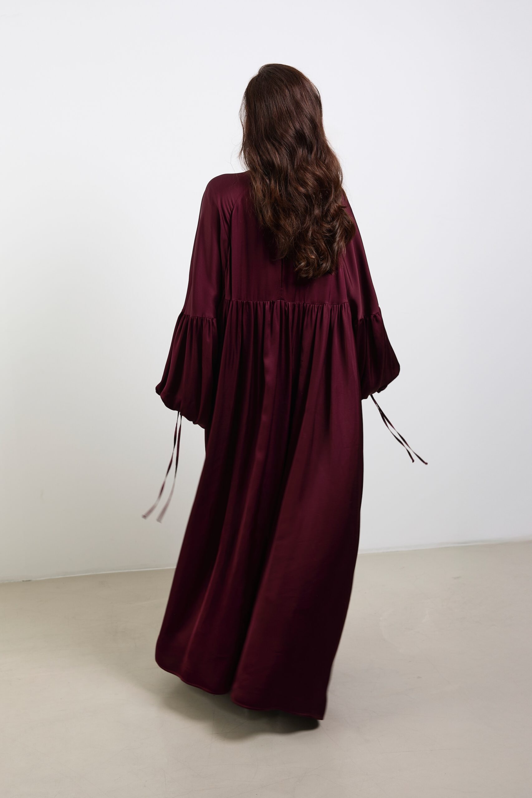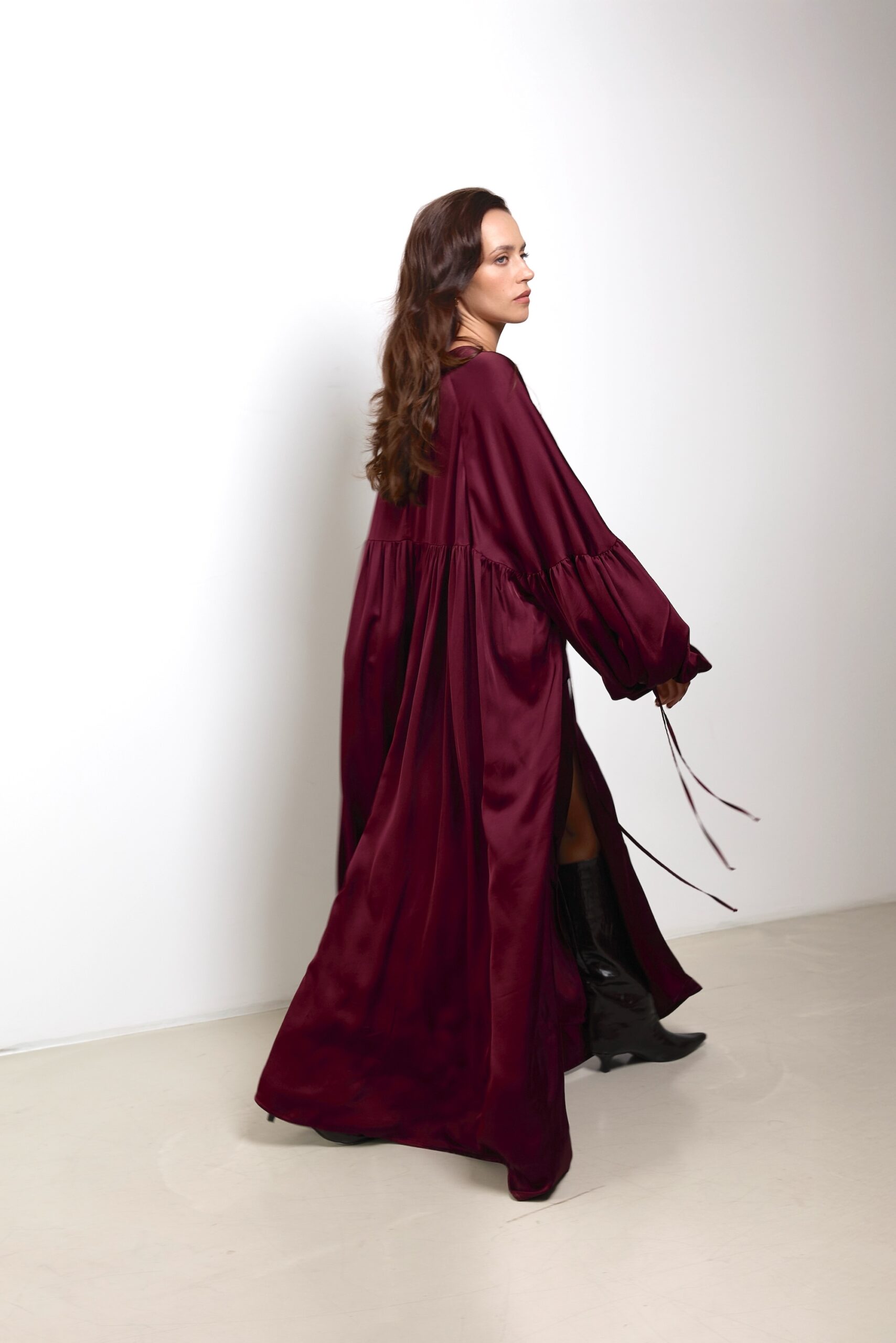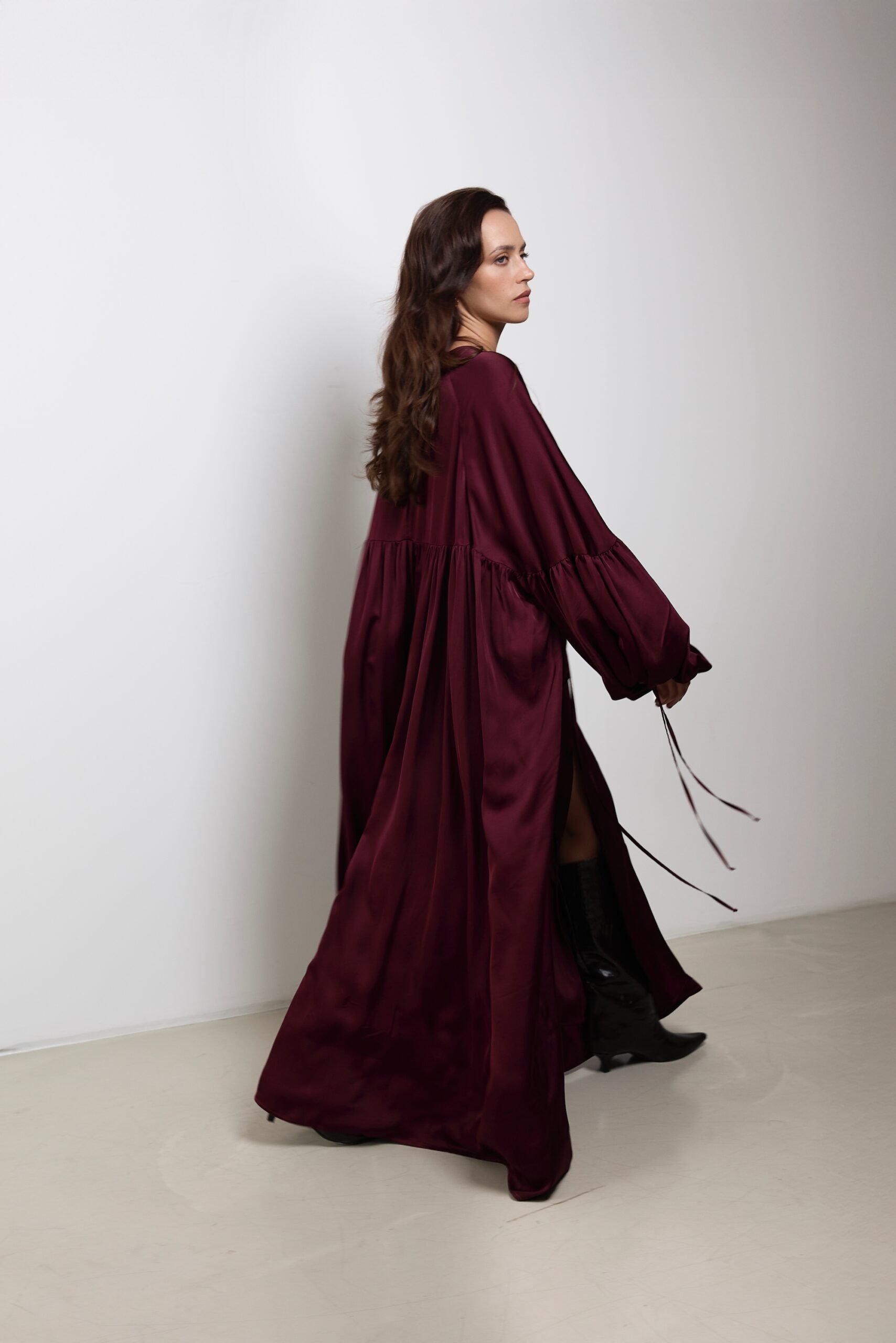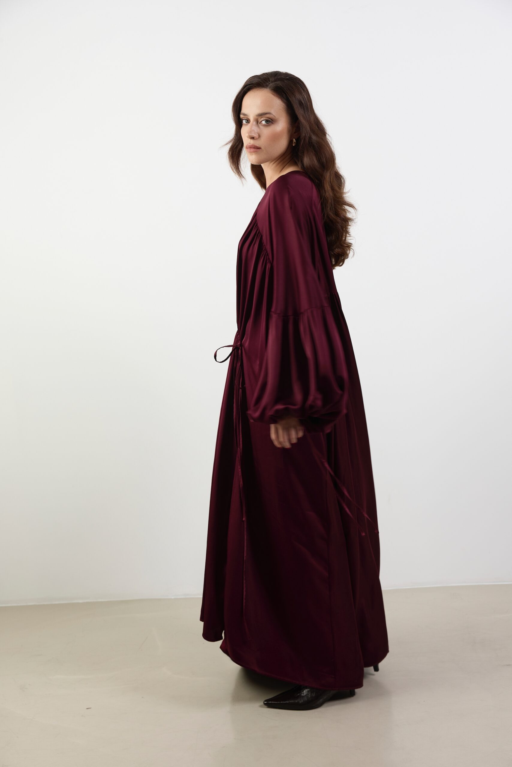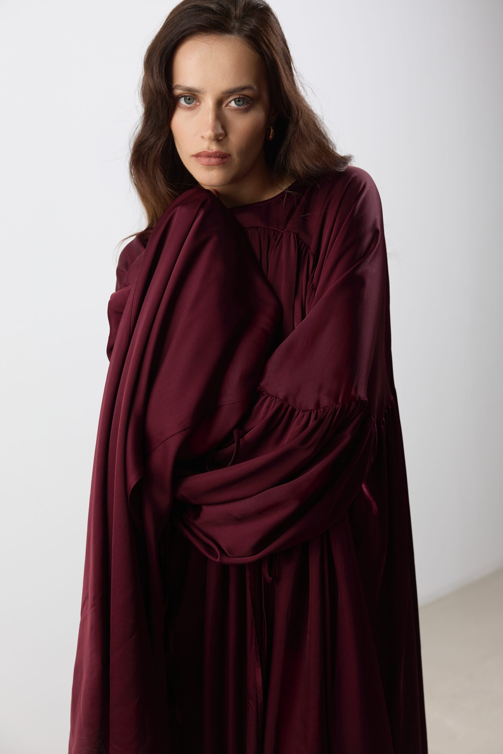 Ta sukienka zachwyca swoim płynnym, teatralnym ruchem i szlachetnym wykończeniem, które nadaje jej aurę nowoczesnej elegancji. Uszyta z miękkiej satyny w głębokim odcieniu burgundu, otula sylwetkę w sposób lekki i zmysłowy. Charakterystyczne marszczenie biegnące przez przód sukienki subtelnie modeluje kształt, tworząc miękkie, architektoniczne linie, które dodają całości wyrafinowania.