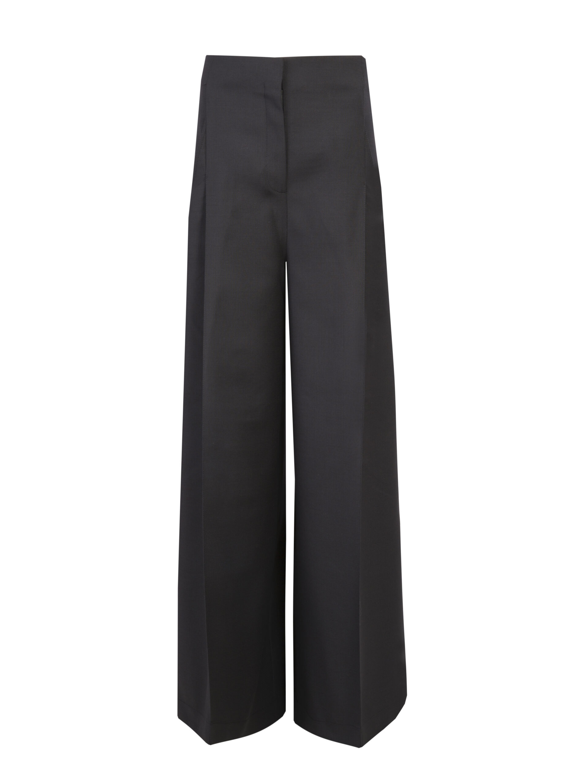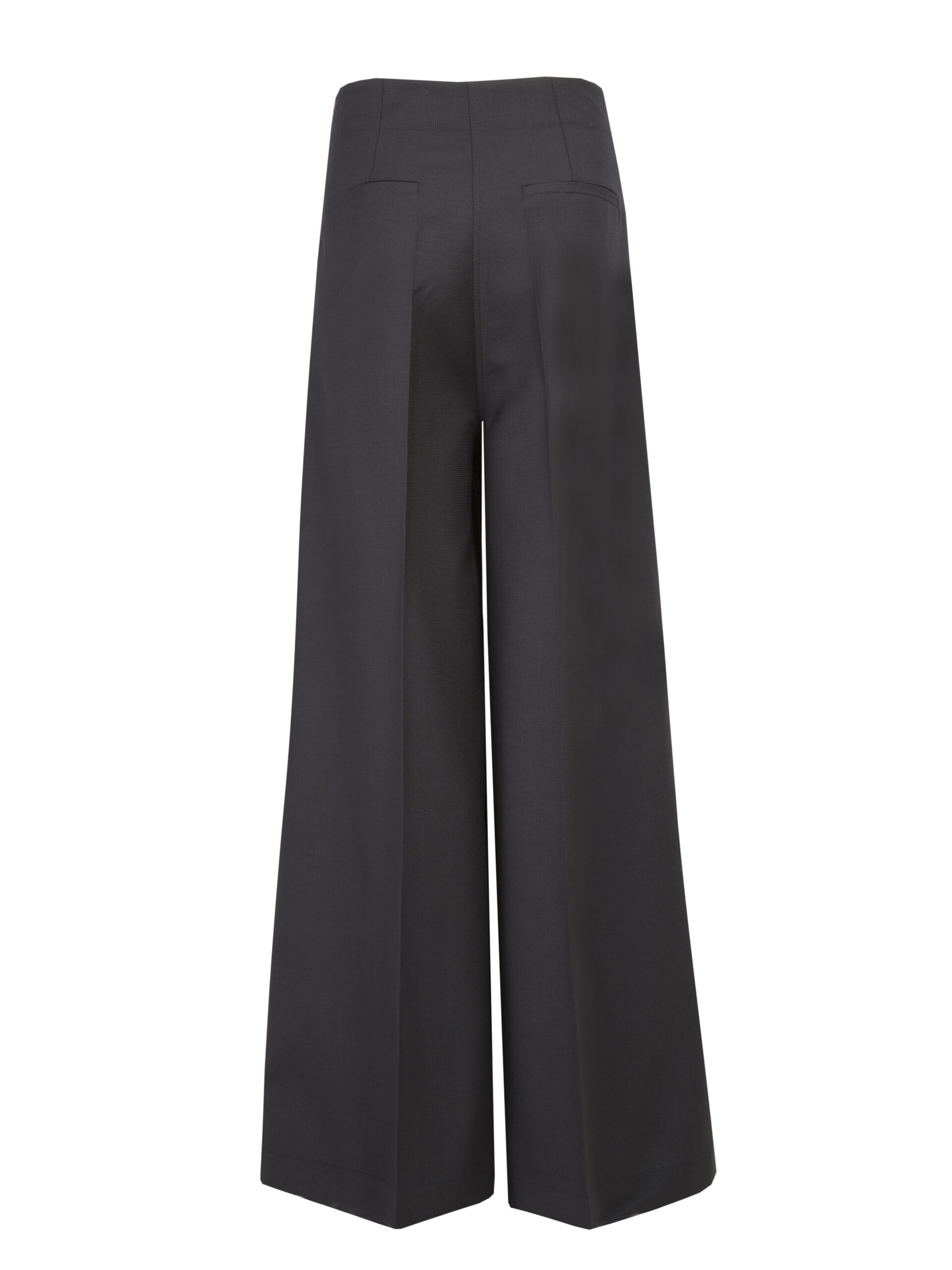 Model ma wysoki stan oraz wyraźnie poszerzane nogawki, które tworzą efekt mocno rozkloszowanej sylwetki – dzięki temu spodnie układają się w elegancką, architektoniczną formę. Zarówno z przodu, jak i z tyłu widoczne są starannie prowadzone, pionowe przeszycia podkreślające strukturę nogawki i optycznie wydłużające linię nóg.
