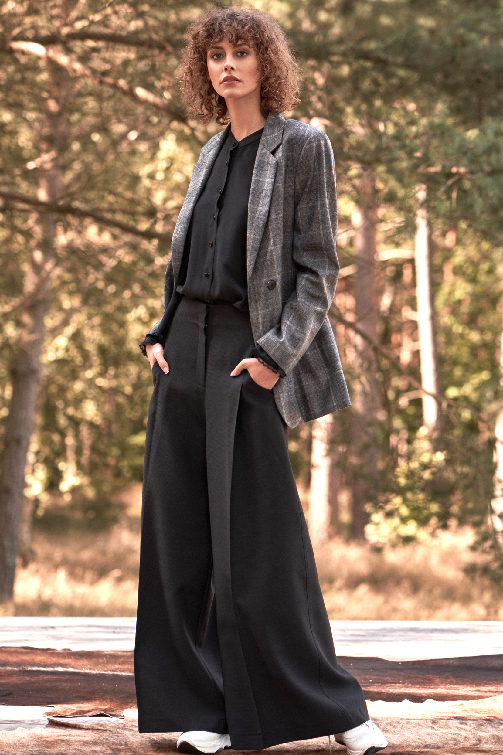 Eleganckie, szerokie spodnie prezentują ponadczasowy, minimalistyczny styl.