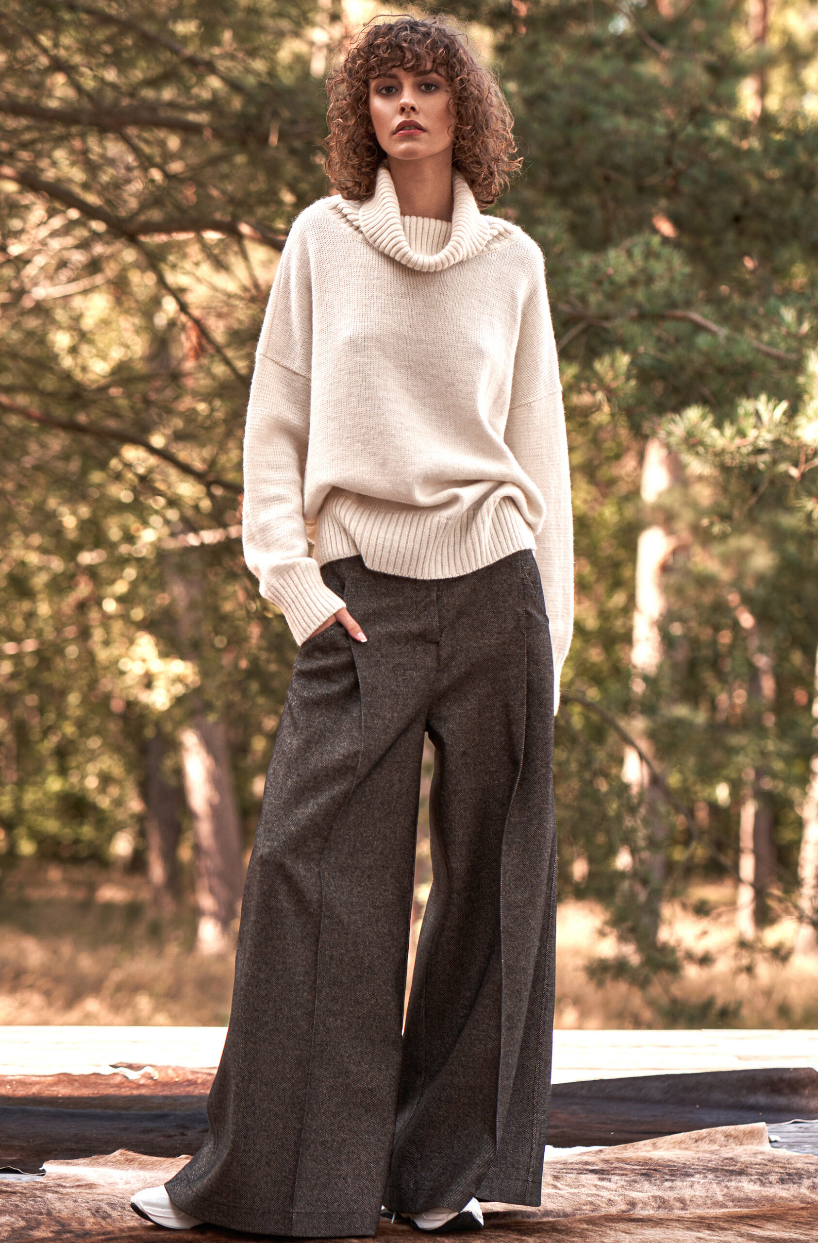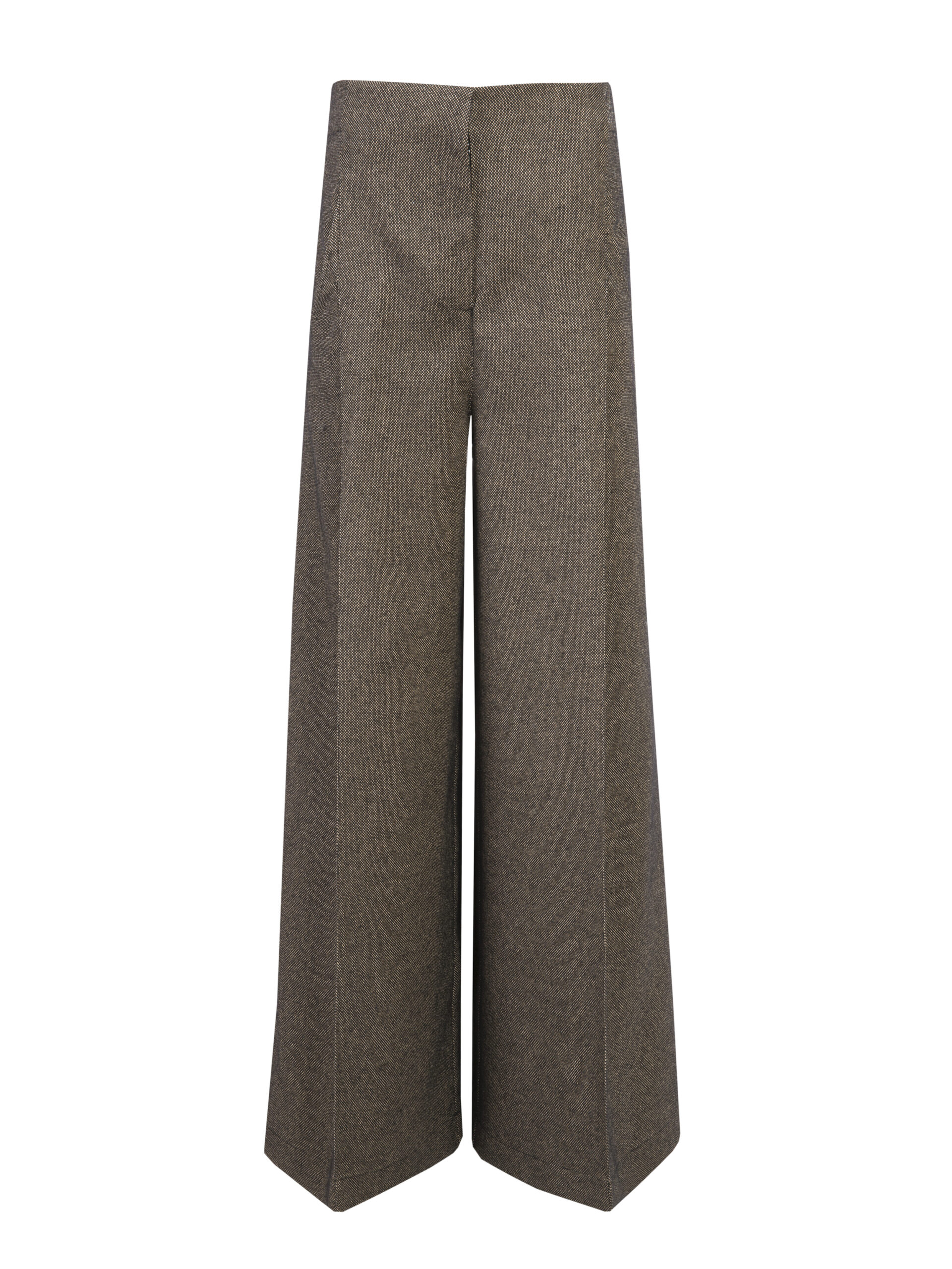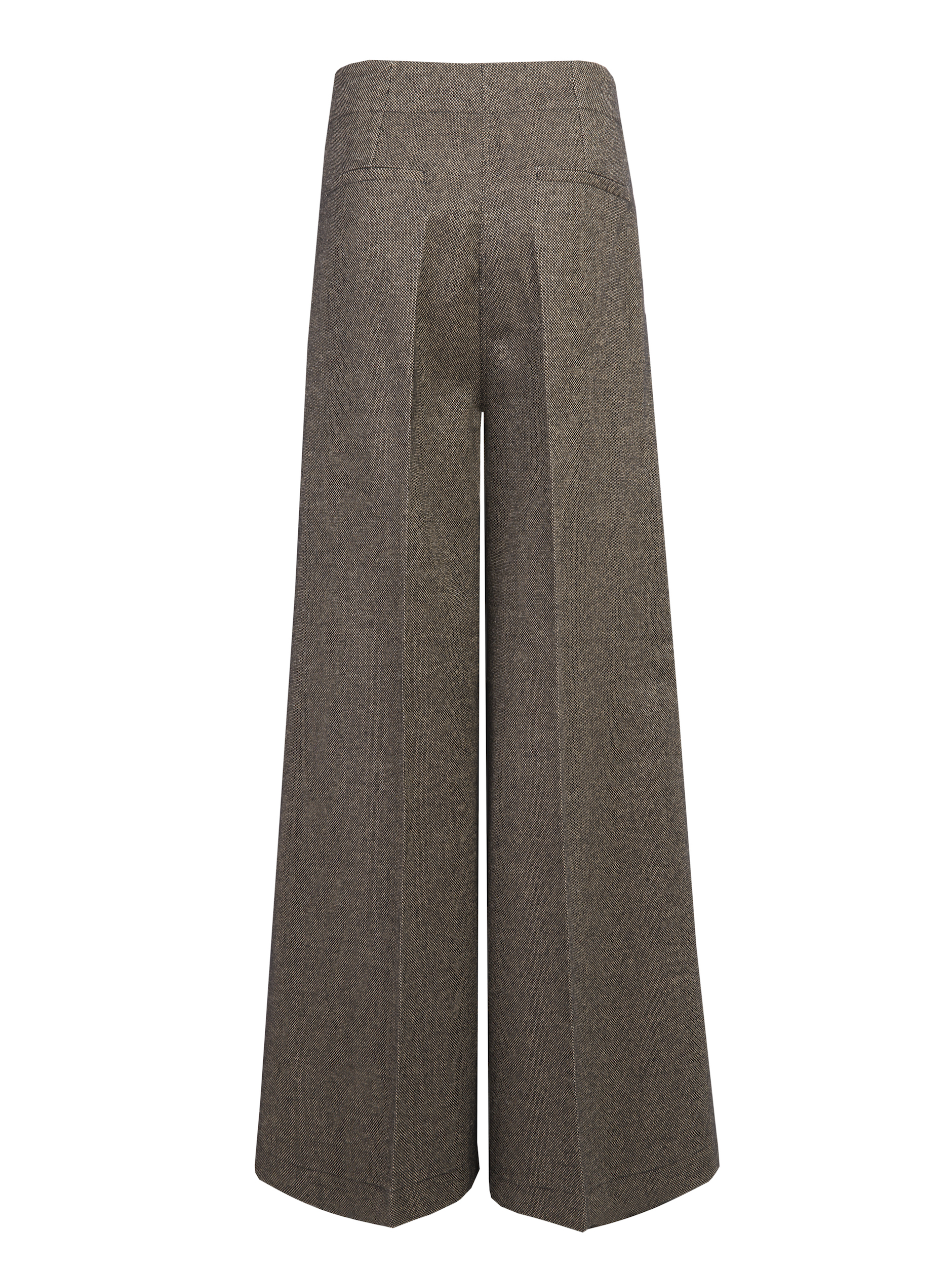 Model ma wysoki stan oraz wyraźnie poszerzane nogawki, które tworzą efekt mocno rozkloszowanej sylwetki – dzięki temu spodnie układają się w elegancką, architektoniczną formę. Zarówno z przodu, jak i z tyłu widoczne są starannie prowadzone, pionowe przeszycia podkreślające strukturę nogawki i optycznie wydłużające linię nóg.