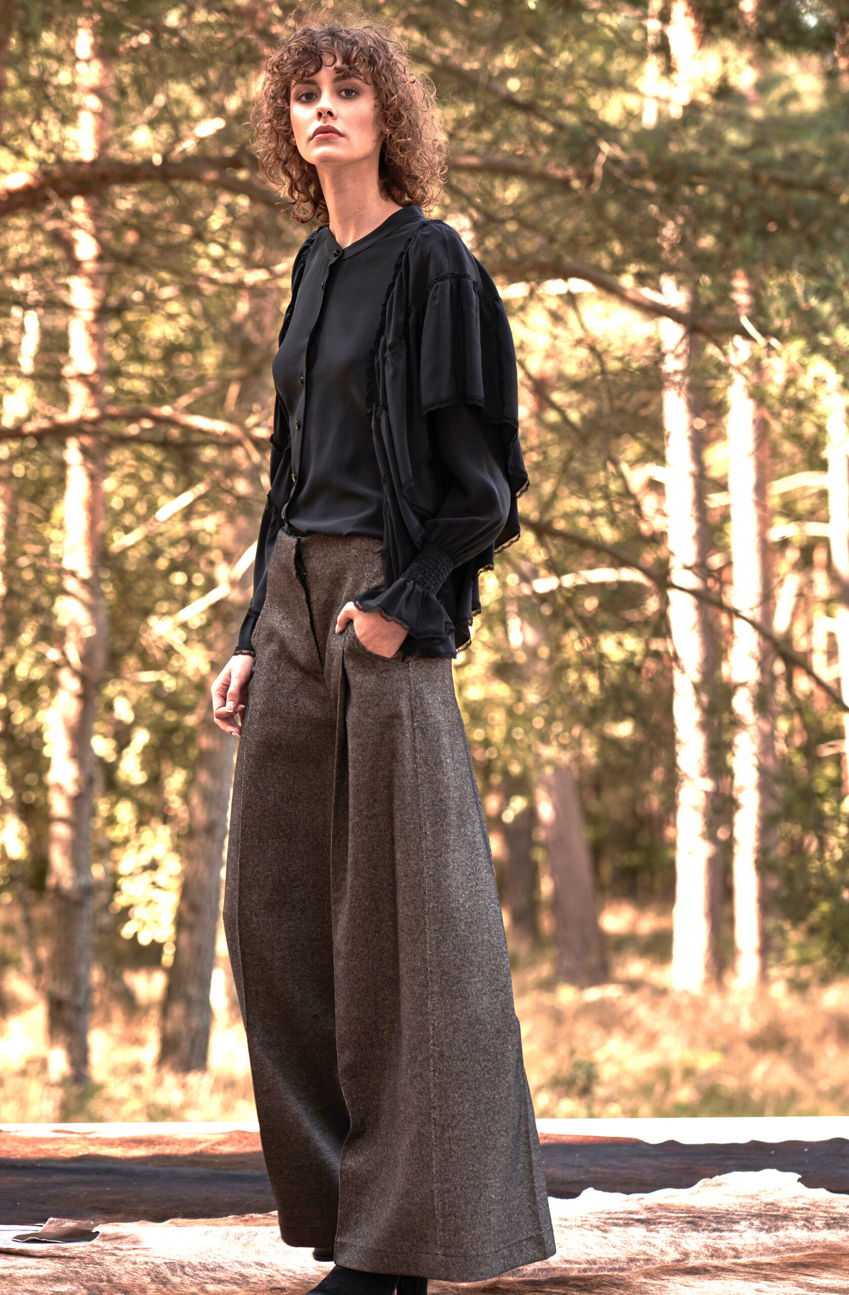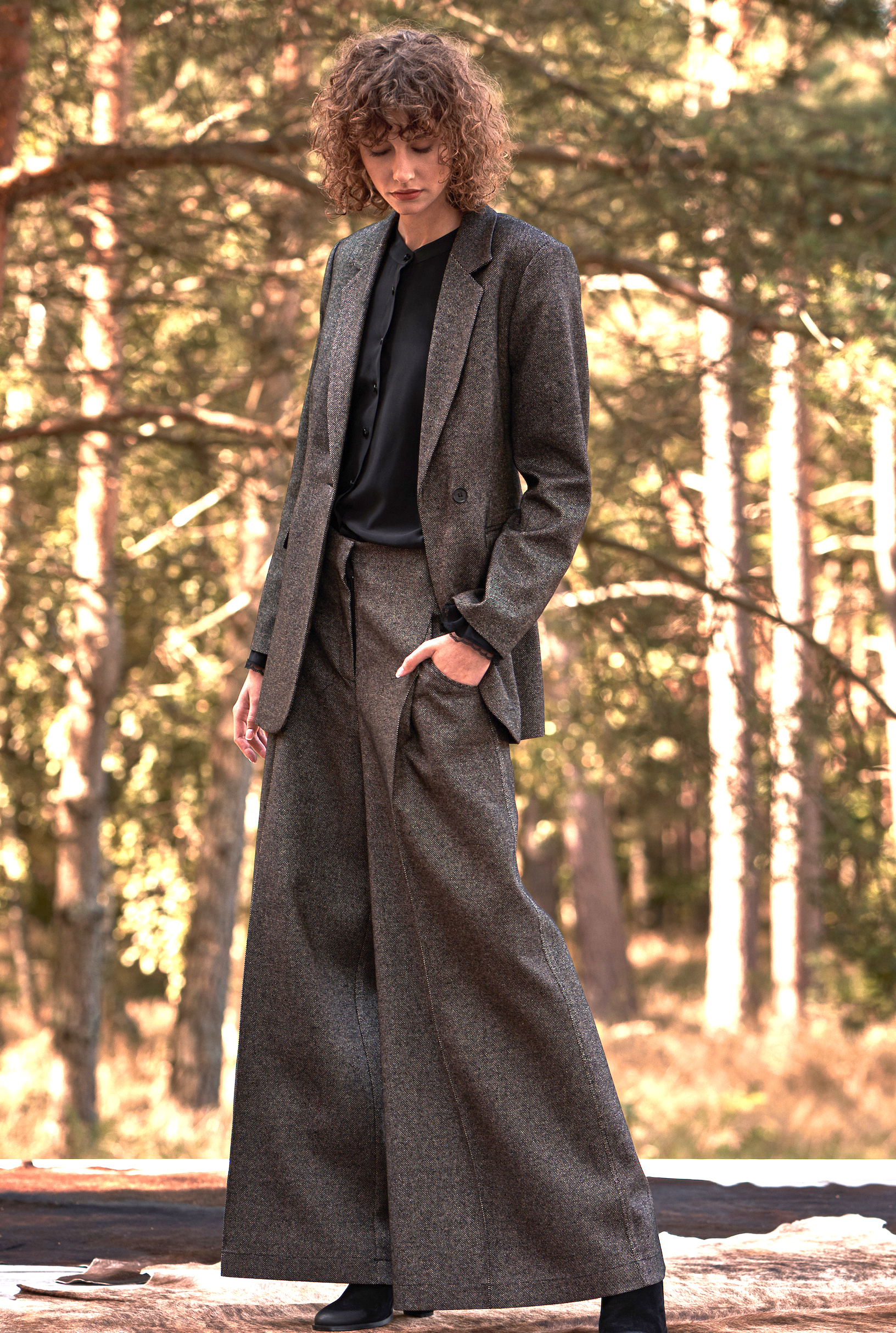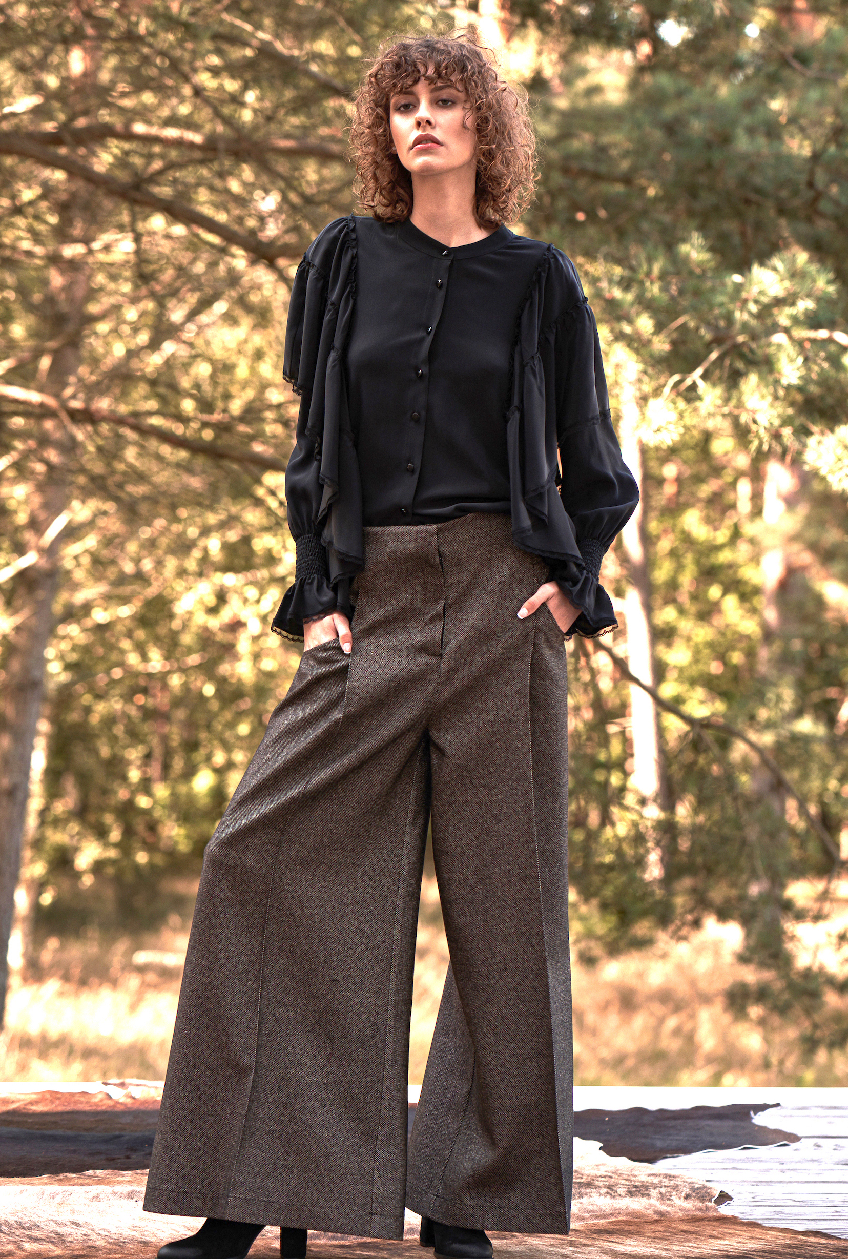 Model ma wysoki stan oraz wyraźnie poszerzane nogawki, które tworzą efekt mocno rozkloszowanej sylwetki – dzięki temu spodnie układają się w elegancką, architektoniczną formę. Zarówno z przodu, jak i z tyłu widoczne są starannie prowadzone, pionowe przeszycia podkreślające strukturę nogawki i optycznie wydłużające linię nóg.