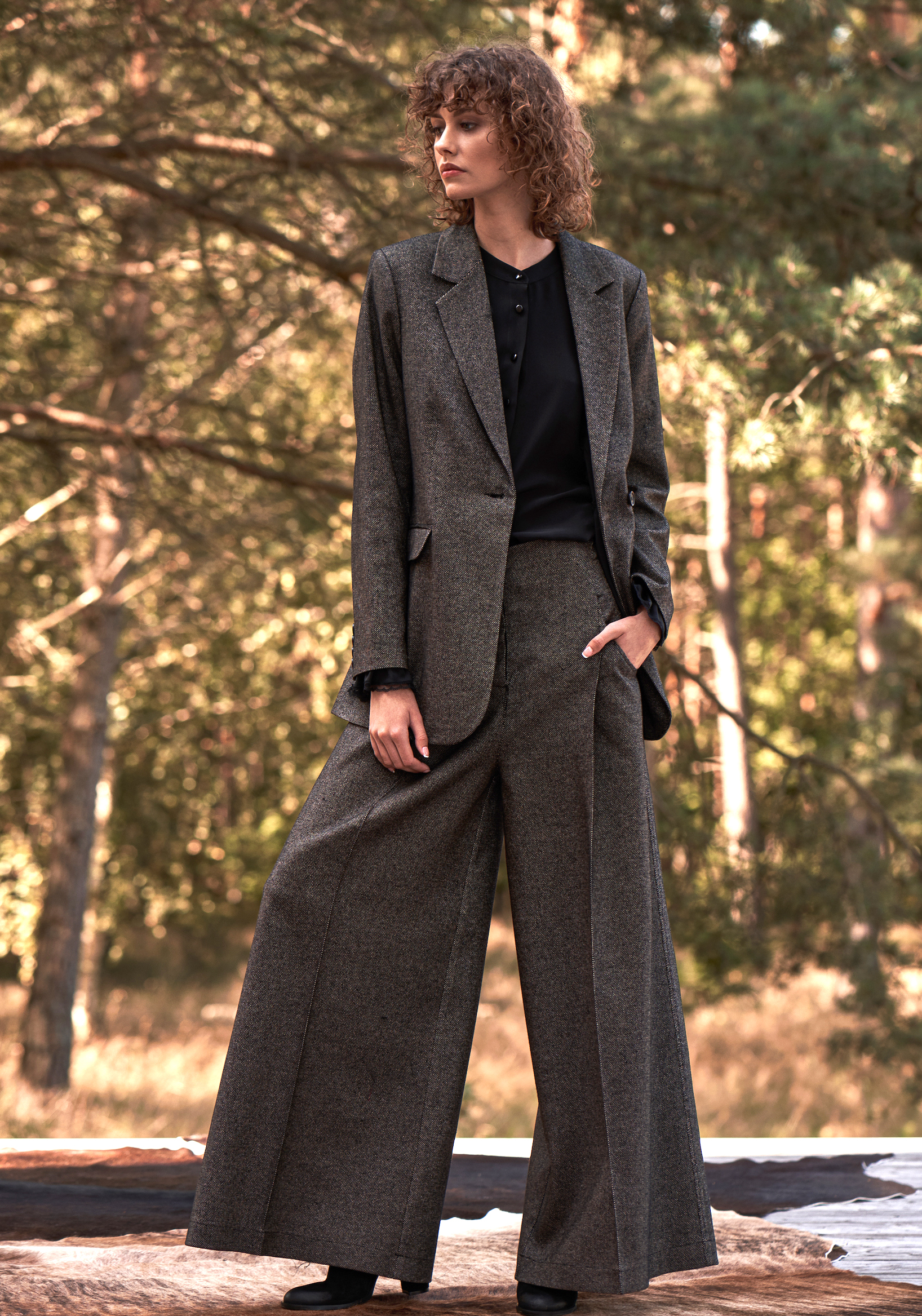Eleganckie, szerokie spodnie z tweedu w odcieniu miodowego melanżu prezentują ponadczasowy, minimalistyczny styl. Wykonane z wysokiej jakości tkaniny o charakterystycznym, delikatnym splocie, łączą klasyczną fakturę tweedu z nowoczesną, geometryczną linią kroju.