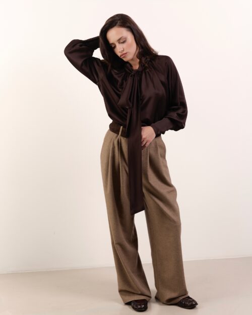 Miękka wełna o naturalnej, ciepłej tonacji pięknie współgra z resztą garderoby, a minimalistyczny kształt kamizelki pozwala nosić ją zarówno na cienkie, dopasowane bluzki, jak i na koszule czy swetry. To element, który dopełnia stylizację, dodając jej struktury i modowej wyrazistości, jednocześnie pozostając niezwykle komfortowym w noszeniu.