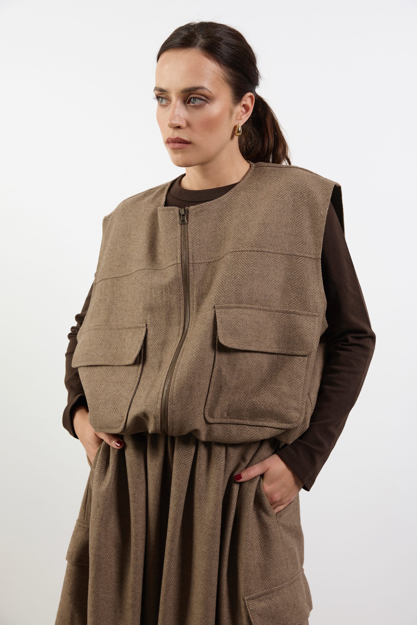 Ta kamizelka została uszyta ze szlachetnej wełny w klasyczny wzór jodełki, który nadaje jej ponadczasowy, elegancki charakter o wyraźnie „heritage’owym” tonie. Prosty, pudełkowy fason został przełamany funkcjonalnymi detalami: dużymi, naszywanymi kieszeniami oraz metalowym zamkiem, które wprowadzają nowoczesny, użytkowy akcent i podkreślają praktyczność projektu.