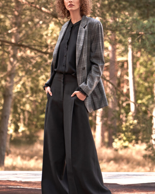 740,00 złEleganckie, szerokie spodnie z tweedu w odcieniu chłodnej szarości prezentują ponadczasowy, minimalistyczny styl. Wykonane z wysokiej jakości tkaniny o charakterystycznym, delikatnym splocie, łączą klasyczną fakturę tweedu z nowoczesną, geometryczną linią kroju.