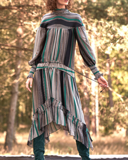 1280,00 złTa jedwabna sukienka midi zachwyca lekkością i swobodą, łącząc naturalny komfort z wyrafinowanym stylem. Delikatna tkanina układa się miękko na sylwetce, a wzór pasków w odcieniach zieleni, czerni i szarości dodaje jej charakteru i subtelnej elegancji. Luźny krój z odcinaną talią i asymetryczną falbaną tworzy płynny, kobiecy kształt, który porusza się z każdym krokiem. Długie, lekko bufiaste rękawy zakończone elastycznymi mankietami oraz miękka stójka podkreślają harmonijną, nieco romantyczną linię sukienki. To model, który sprawdzi się zarówno na co dzień, jak i podczas wyjątkowych okazji — wystarczy dobrać ulubione kozaki lub minimalistyczne dodatki, by stworzyć stylizację pełną klasy i naturalnego szyku.