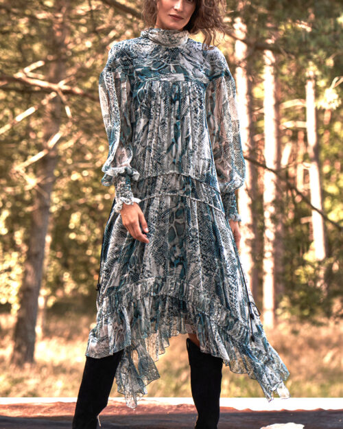 1280,00 złTa jedwabna sukienka midi zachwyca oryginalnym, inspirowanym naturą wzorem, w którym przeplatają się odcienie błękitu, szarości i turkusu, tworząc nowoczesną interpretację motywów zwierzęcych. Delikatny jedwab miękko układa się na sylwetce, nadając całości lekkości i subtelnej elegancji. Luźny, swobodny krój z odcięciem w talii i wielowarstwowymi falbanami tworzy efekt płynnego, nieco romantycznego ruchu. Bufiaste rękawy zakończone marszczonym mankietem oraz miękka stójka podkreślają kobiecy charakter sukienki, dodając jej finezyjnego wykończenia. To model idealny na wyjątkowe okazje, spotkania czy wieczorne wyjścia — wyrazisty, a jednocześnie niezwykle lekki i komfortowy w noszeniu.