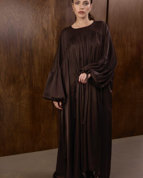 1080,00 złTa sukienka zachwyca swoim płynnym, teatralnym ruchem i szlachetnym wykończeniem, które nadaje jej aurę nowoczesnej elegancji. Uszyta z miękkiej satyny w głębokim odcieniu gorzkiej czekolady, otula sylwetkę w sposób lekki i zmysłowy. Charakterystyczne marszczenie biegnące przez przód sukienki subtelnie modeluje kształt, tworząc miękkie, architektoniczne linie, które dodają całości wyrafinowania.