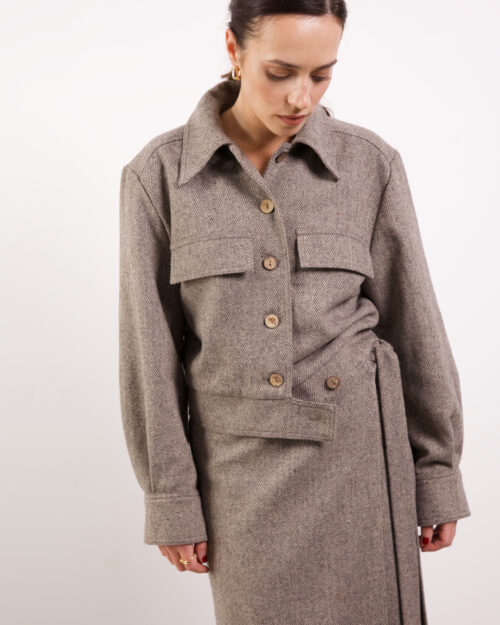 Konstrukcja kurtki została oparta na formie utility-shirt, taliowanie z efektowną zapinaną klapą i paskiem pozwala nosić model na dwa sposoby: luźno, w swobodnej, lekko pudełkowej linii, albo z podkreśloną talią, tworząc bardziej elegancki, rzeźbiarski kształt.
