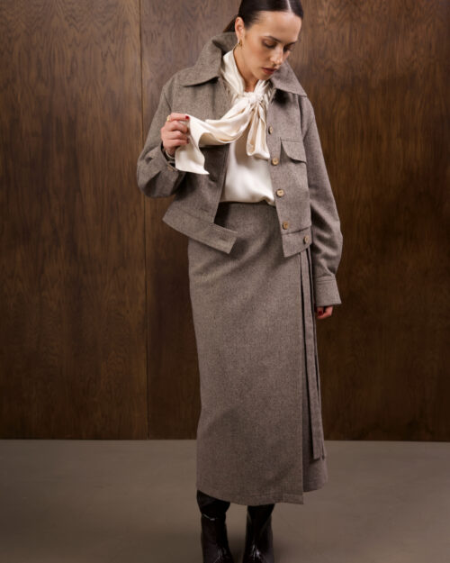 Neutralny, ziemisty odcień tweedu sprawia, że kurtka harmonijnie wpisuje się w estetykę kolekcji Heritage Edit, podkreślając jej związek z tradycją, rzemiosłem i naturalnymi tkaninami. To wszechstronny model, który sprawdzi się zarówno w codziennych stylizacjach, jak i w bardziej wyrafinowanych zestawach — idealny dla kobiet ceniących jakość, detal i dyskretną, ponadczasową elegancję.